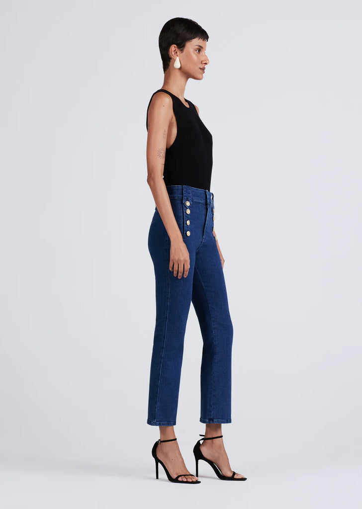 iconic cropped trouser with gold sailor button details along the hips is updated this season in a premium comfort stretch Italian denim with a stone-wash finish. Zip fly with button closure, flat front, tonal buttoned belt loops and stitching.