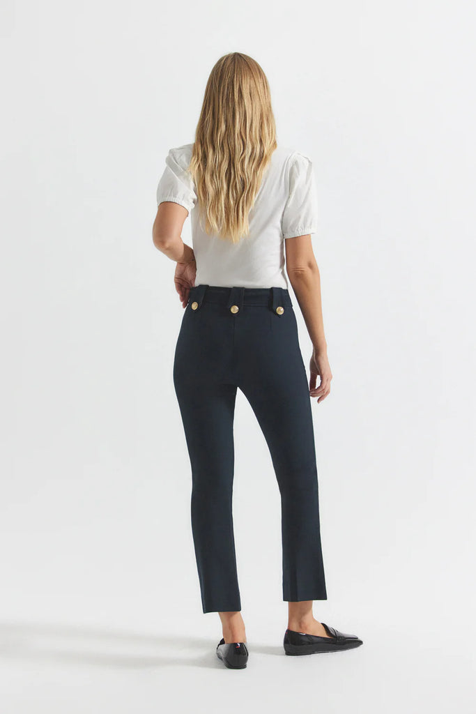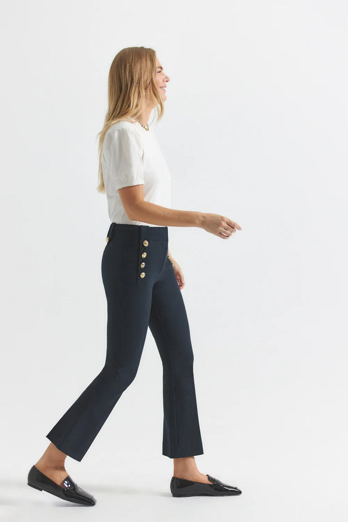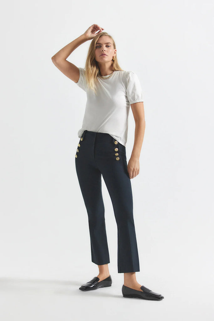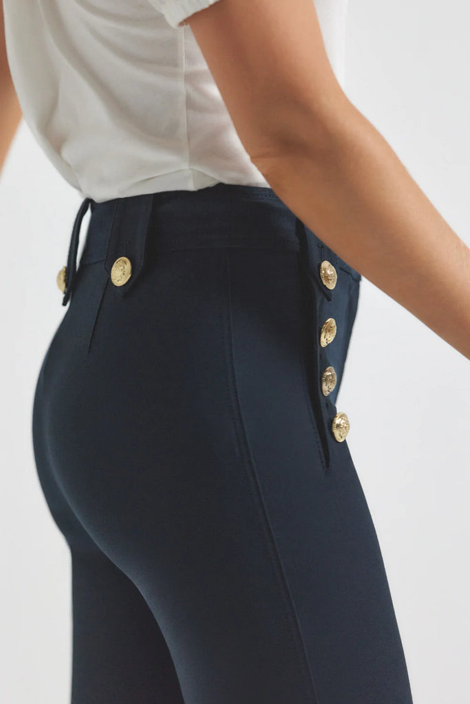 The iconic cropped twill trouser with gold sailor button details along the hips. Zip fly with button closure, flat front, tonal buttoned belt loops and stitching.