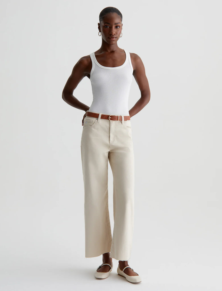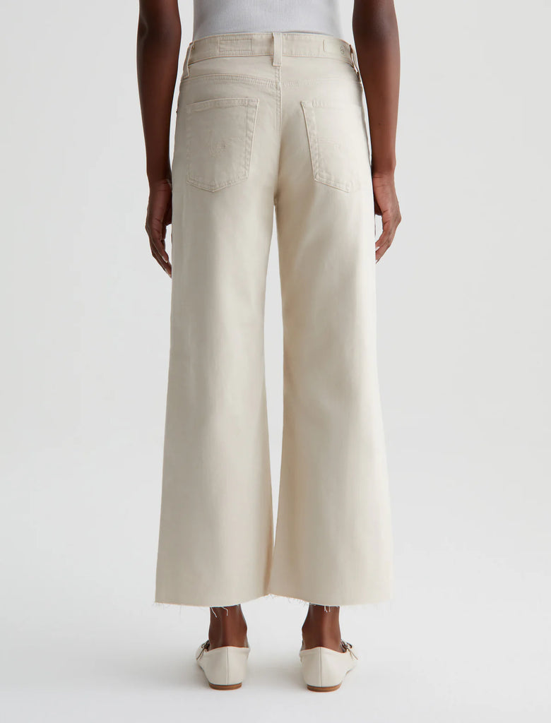 The Saige Wide Leg Crop is an off-white mid-rise jean with loose, cropped legs and raw hems. These women's wide-leg jeans come in our 8.7 oz. Hyper Soft Bull Denim featuring dual-elastic for supreme comfort and advanced recovery. AG Cloud Soft Denim™ fabrics feature special left-hand twill construction that allows the yarns to gently relax and untwist for a luxe, supple feel. It's designed to get even softer the more you wear it.