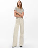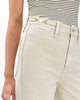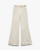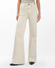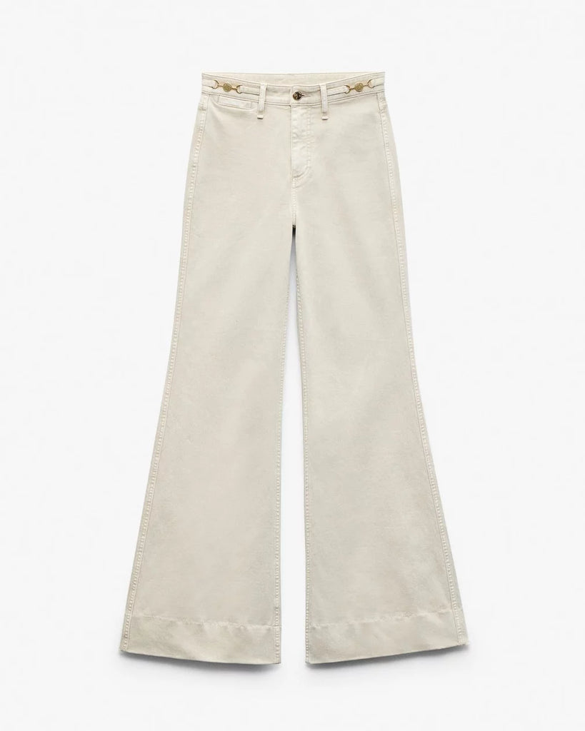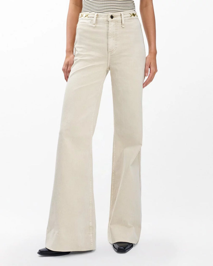 The Skylar. Standout trouser-style jeans with a high rise and roomy legs that gradually open into super-wide, flared hems. Signature metal horsebit accents at the waist further dial up its distinction. Crafted from our Vintage Stretch denim for a broken-in look & feel with a comfortable touch of stretch. In Sandstone, a muted light beige wash.