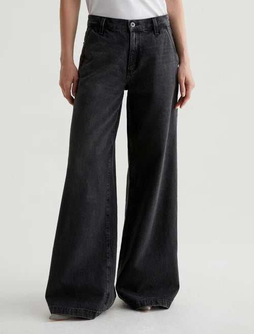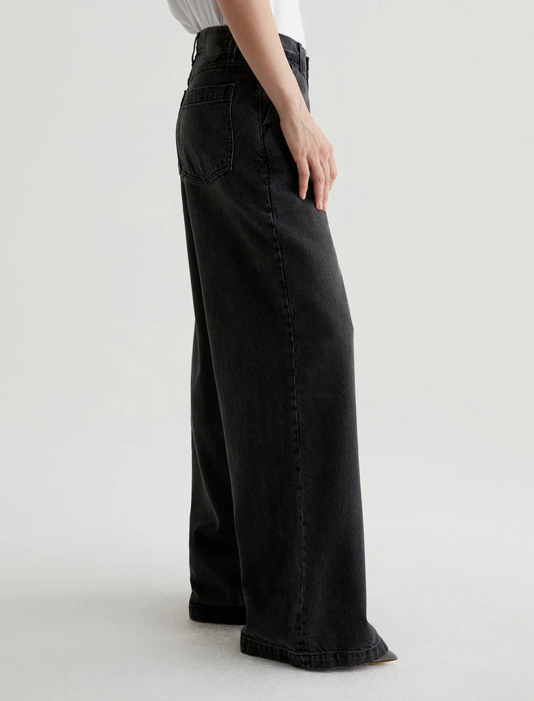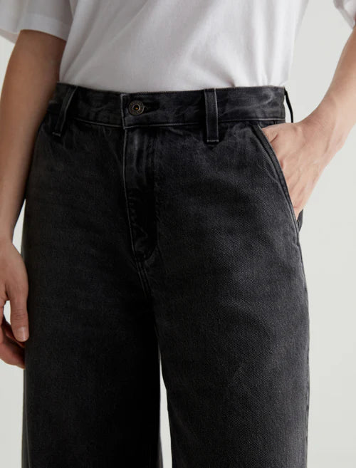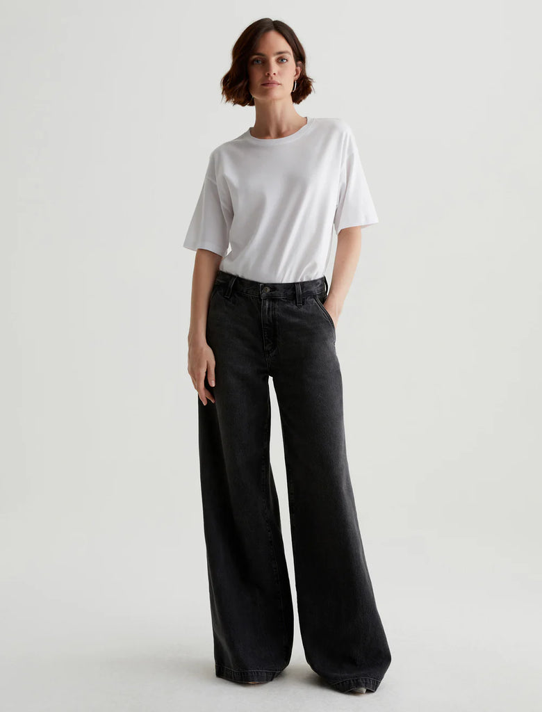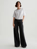 Stella is a low-slung palazzo style in faded black denim. Designed to be worn lower on the waist, it's balanced by a super-wide cut through the legs. These wide-leg pants are crafted from 11.25 oz. Organic Black Rigid denim—an Italian fabric incorporating recycled and organic cottons with lyocell for sustainable softness and durability. Subtle fading and a hint of whiskering create a worn-to-perfection look. Complete with slant pockets at the front.