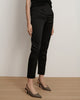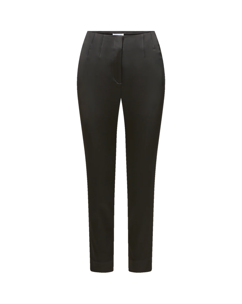 A sleek dress pant with versatility. Expertly tailored in the USA from premium Italian satin, the Stila's high-rise Hollywood waistband defines, while its slim, straight leg elongates—cropped at the hem to show off your shoes. Welt pockets and a concealed hook-and-bar closure create a clean, streamlined finish. Pair this black trouser with an oversized shirt or sweater to elevate the everyday—or with the coordinating Cynthia satin jacket for a chic tailored set.