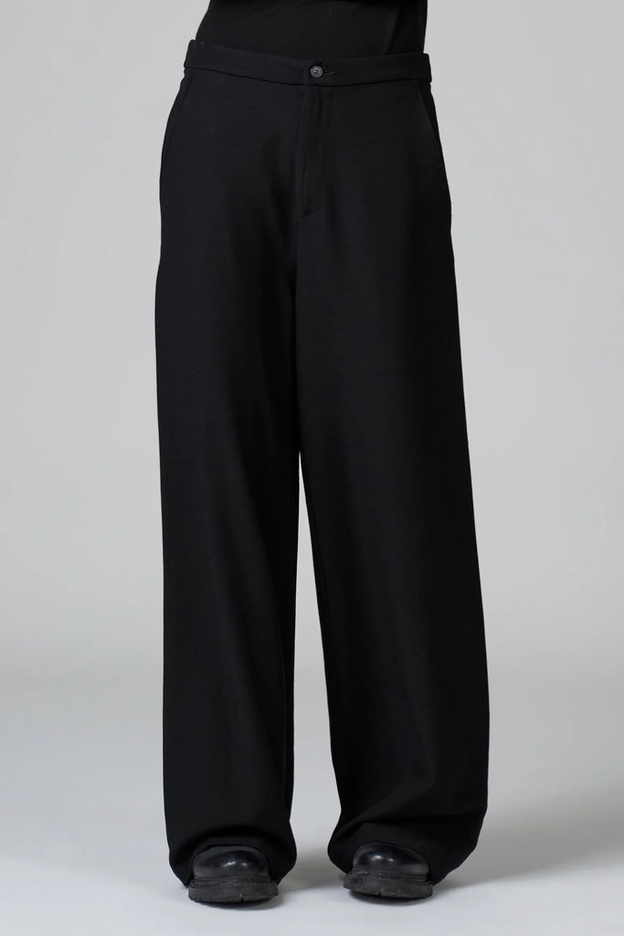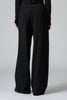 Stretch wool and viscose trousers with a fit that is close around the waist and looser on the thighs, opening up to flared bottoms. A gathered elastic back on the waistband offers enhanced comfort. Two slash pockets at the front. Fastened with a central zip and button.