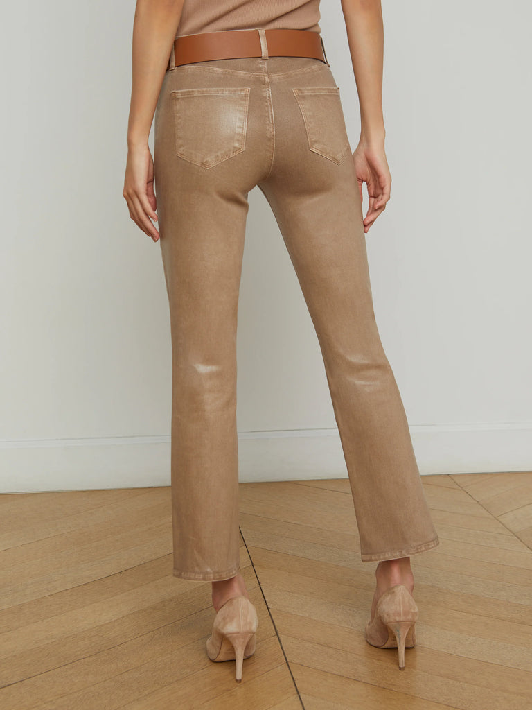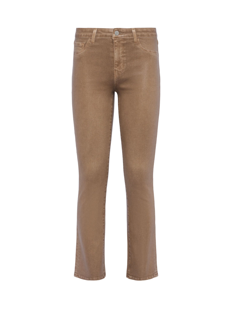 A slim fit from hip to knee finishes in a beautifully proportioned micro bootcut. Now in neutral leather-look coated denim.• Coated stretch denim• High rise• Faux front pockets• Functional back pockets• Zip fly and button closure• 27” inseam