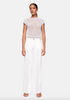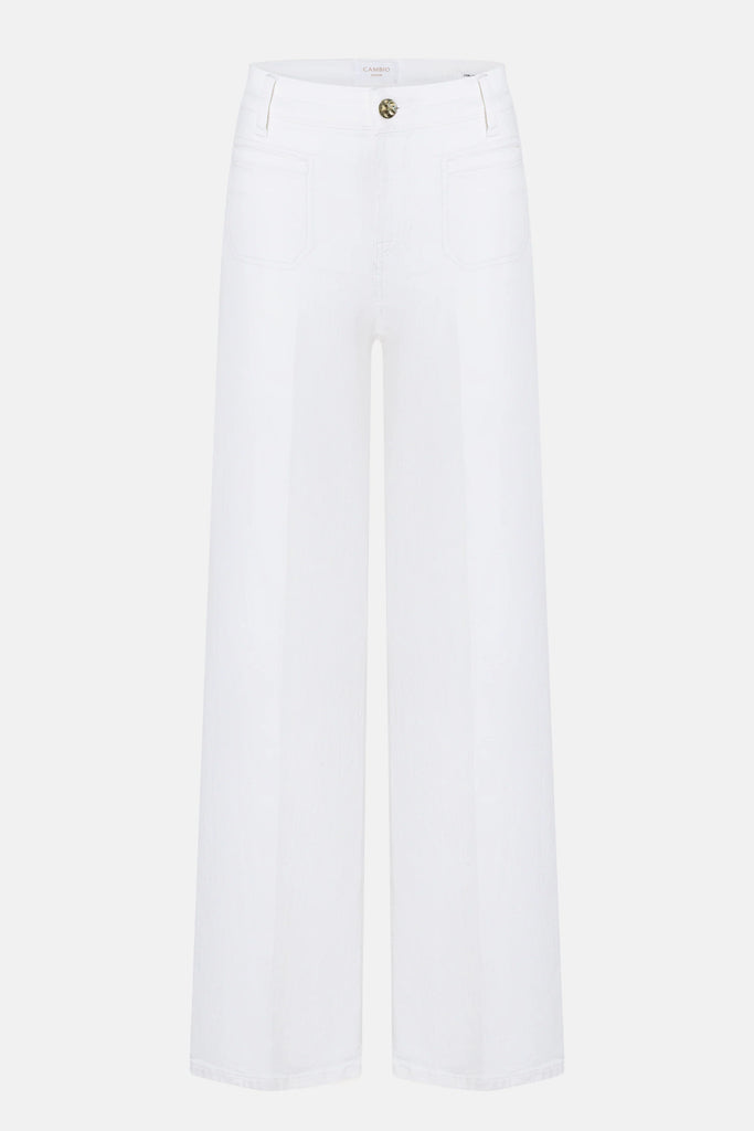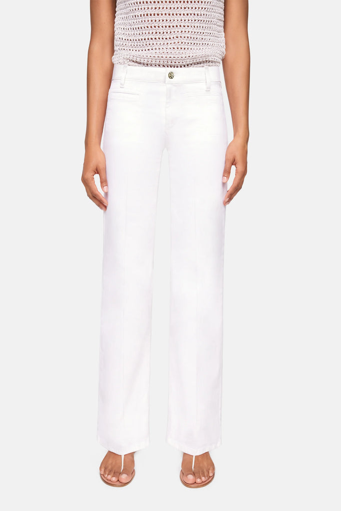Wide Leg Denim TESS WIDE LEG in full length. This white denim boasts power stretch for comfort and a perfect fit. The wide, flowing leg creates a stylish and modern silhouette that's a must-have in your wardrobe!