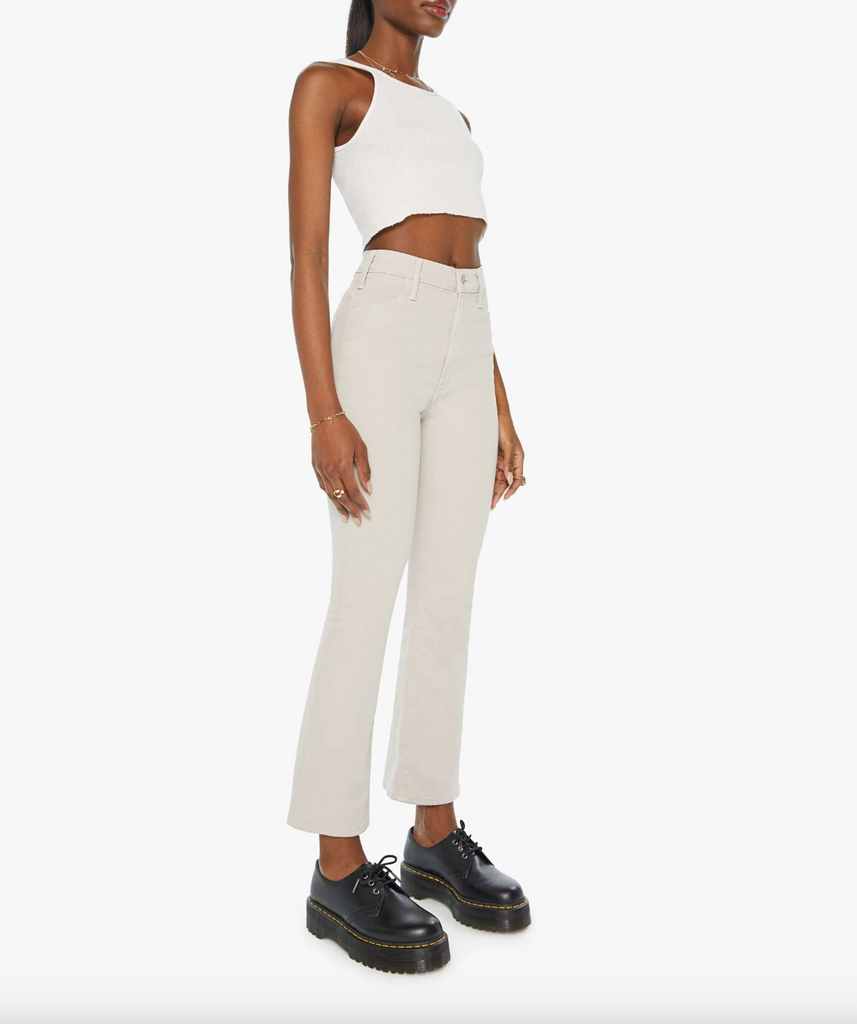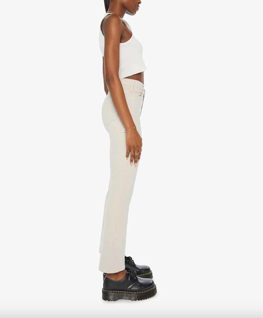 This high-rise bootcut has a 28.25-inch inseam and a clean hem. Cut from stretch fabric, the pants are designed in light grey.