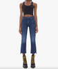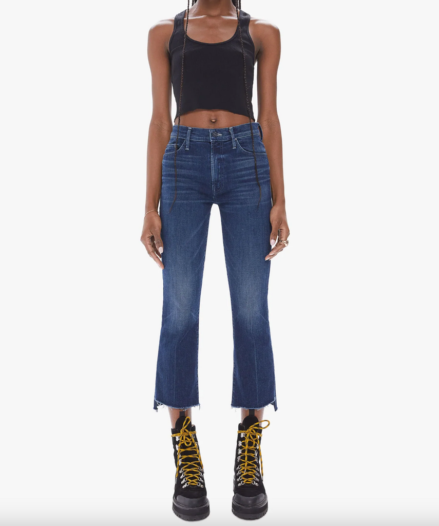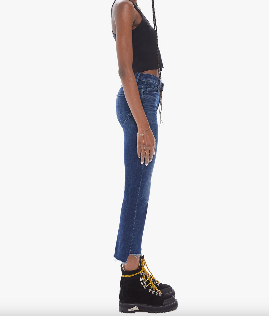 The goods. This iconic high-waisted bootcut hits at the ankle with a frayed step-hem. Made from versatile stretch denim, Good For You is a dark blue wash with black hardware, whiskering and subtle fading at the knees. MOTHER knows best.