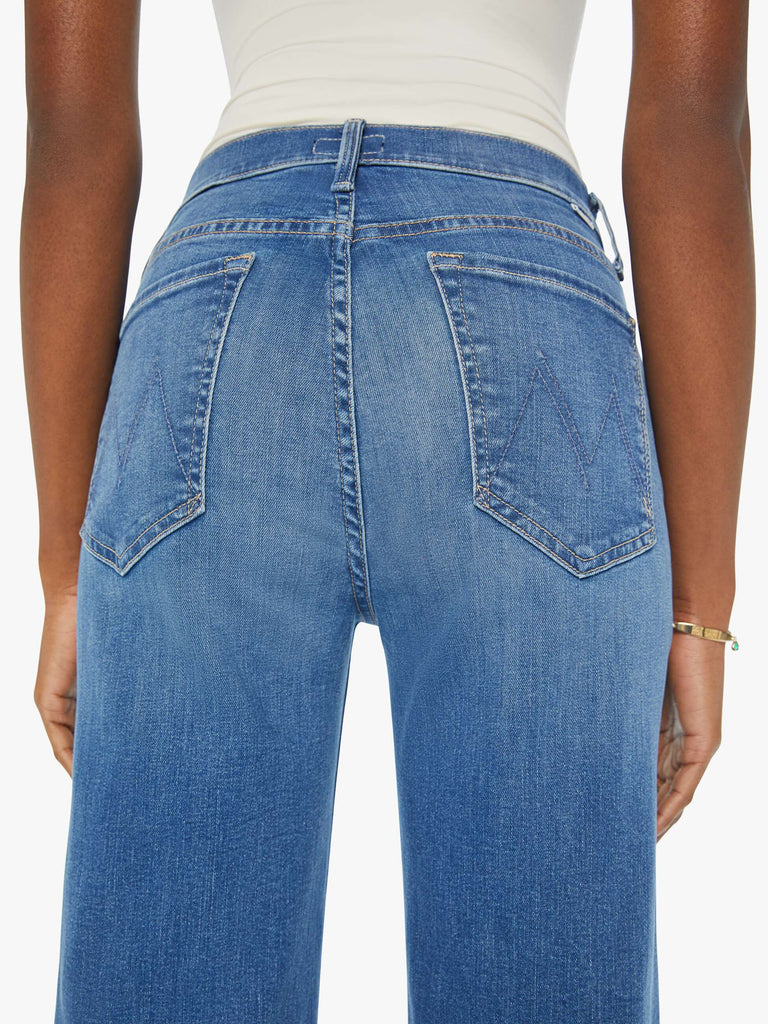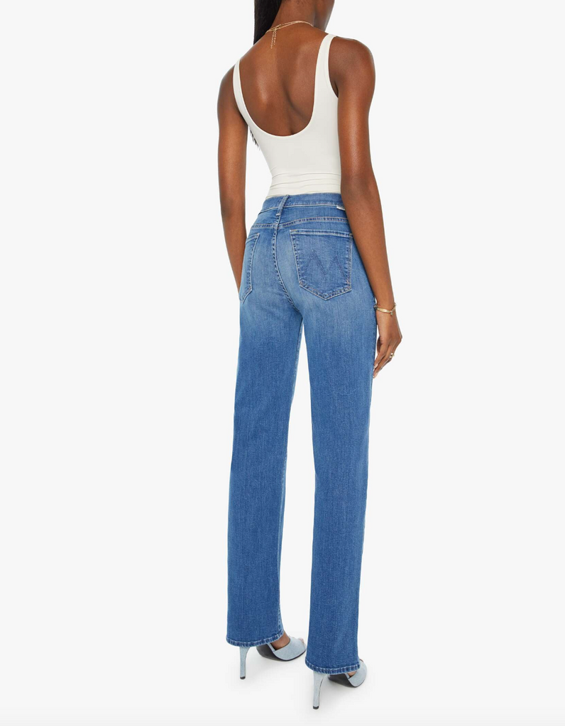 XOXO. High-waisted jeans with a wide straight leg, zip fly and a long 33-inch inseam with a clean hem. Made from stretch denim, Lhasa Love is a mid-blue wash with fading and whiskering.