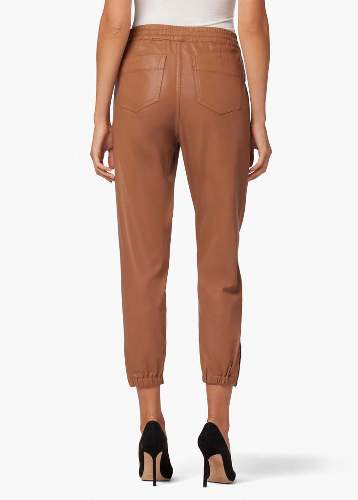 The tapered leg and pull on waistband make the Sienna jogger comfortable. The pressed and coated fabric in rich hues with leather-like sheen make these joggers noticeable. Style with heels for a night out or pair with sneakers for an afternoon lunch.
