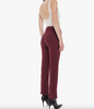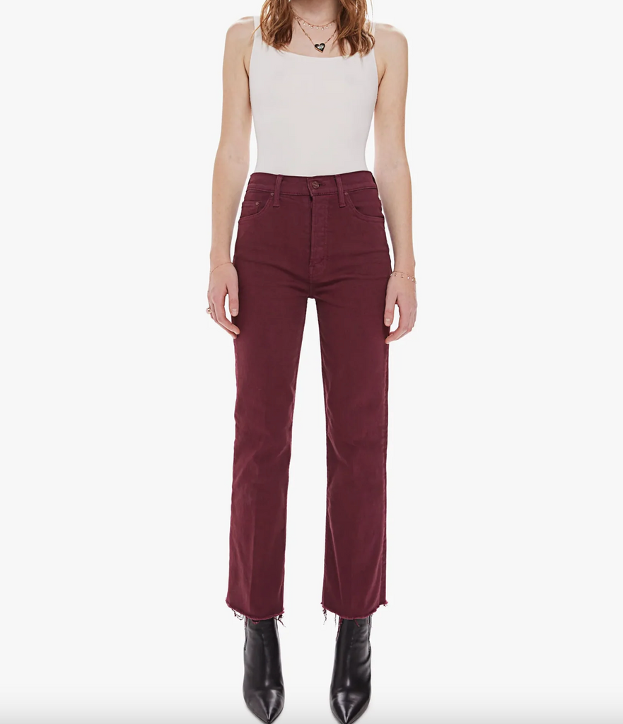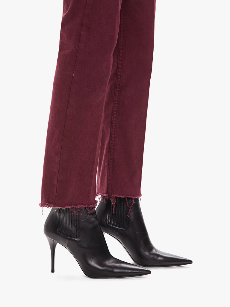 Pour decisions. An ultra high-rise flare with a button fly and a raw hem that hits at the ankle. Cut from stretch cotton fabric in a red-wine hue with tonal hardware for a monochrome look.