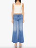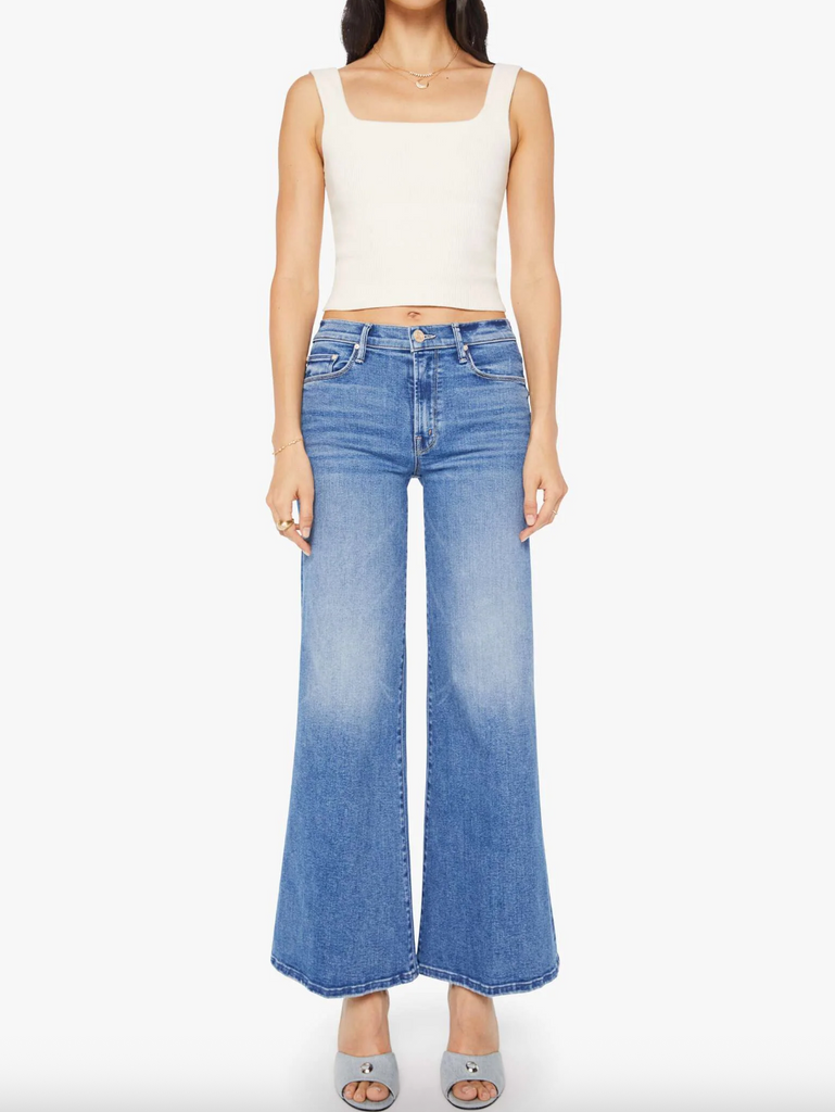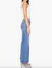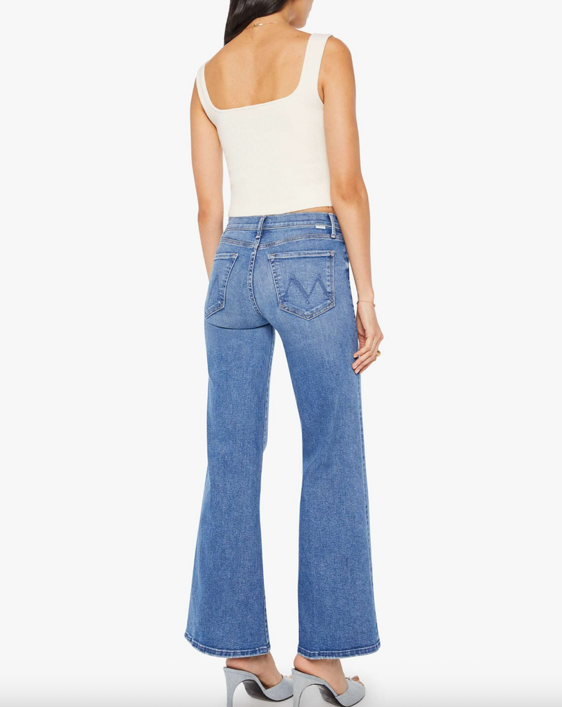 Strike three. High-rise pants with a flared, wide leg and 31-inch inseam with a clean hem. Cut from super stretchy denim, Swing And A Miss is a mid-blue with whiskering and fading at the knee.