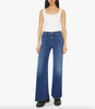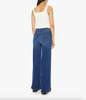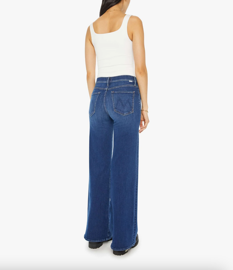 Over your shoulder. A flared, wide-leg jean with a high rise and a clean, 32-inch inseam. Made from stretch denim, On Your Left is a mid-blue wash with whiskering and fading at the knees.