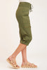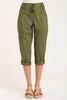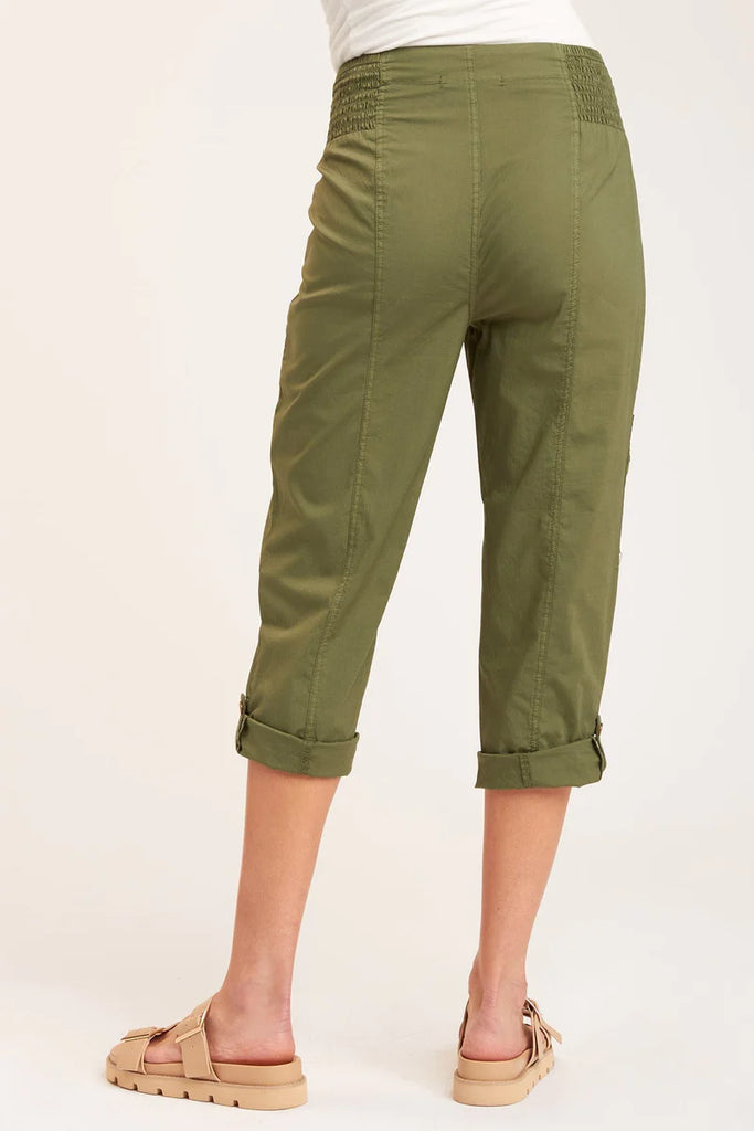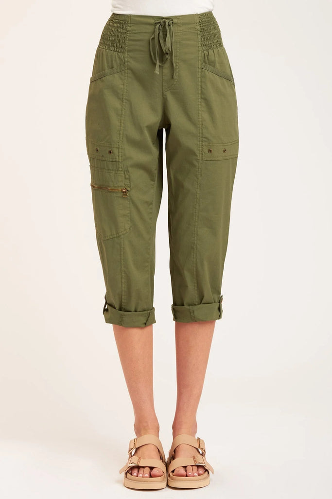 Smocked side waist panels makes Topper an easy to throw on kind of pant. Featuring a drawstring waist, front pockets, one zippered cargo pocket and a tabbed hem.