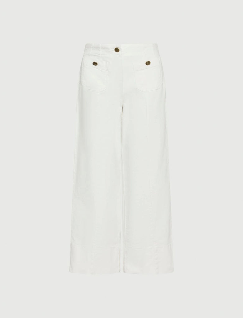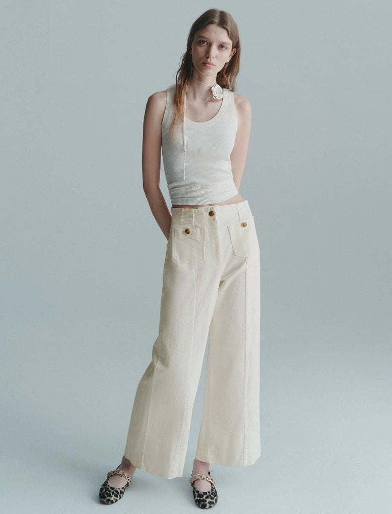 The high waist and wide leg are the perfect ingredients for an ultra-feminine silhouette. The ‘70s-inspired front pockets feature small buttons and pressed pleats.