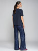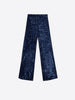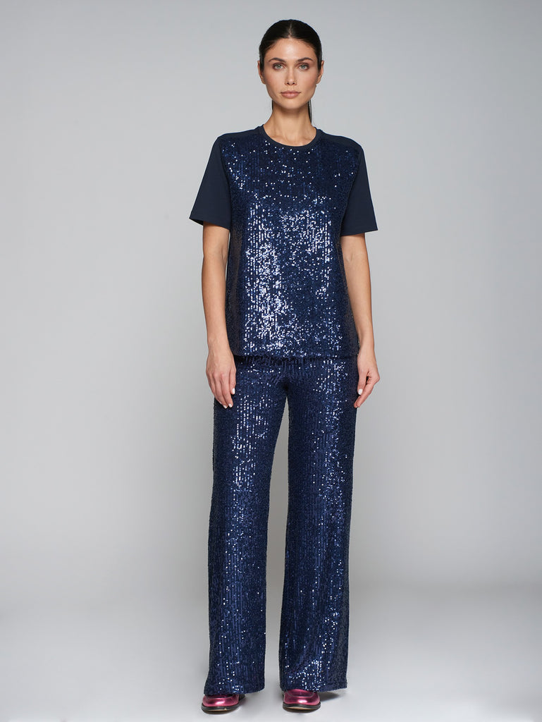 Navy blue velvet flare trousers covered in sequins. Lined. Extra comfort perfect fit fabric. Elastic waistband. Made in Portugal.