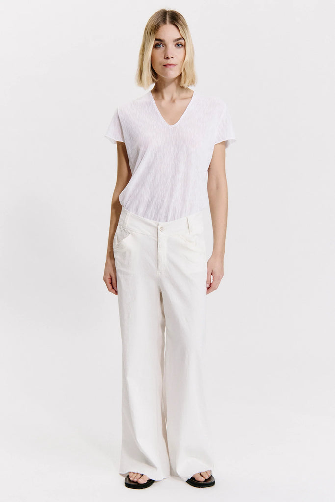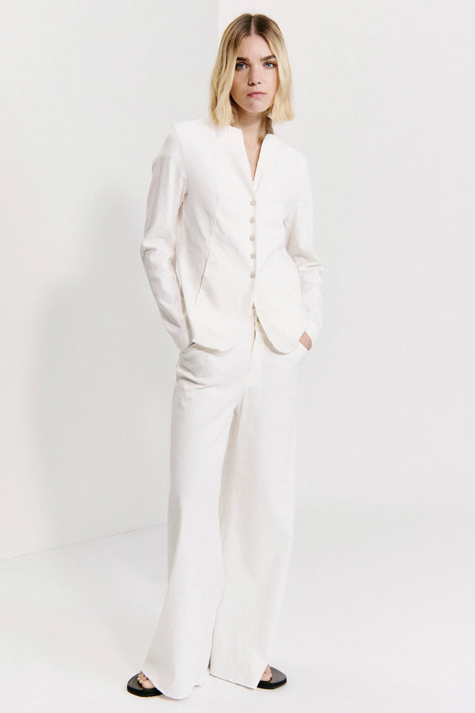 Slim-fit stretch linen blend trousers with frog mouth pockets and flared legs with frayed hems. Garment dyed. | 1014.CFDTRZF153.101