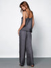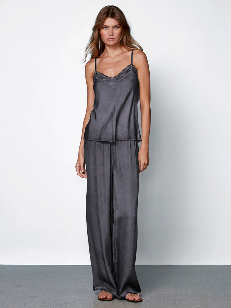 These trousers are made of a smooth and lightly shiny material that drapes elegantly and gives an exclusive expression. They have wide, straight legs and a comfortable elastic waistband, ensuring a flexible fit. The simple design makes the trousers versatile and easy to style for both casual and more festive occasions.