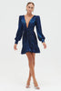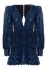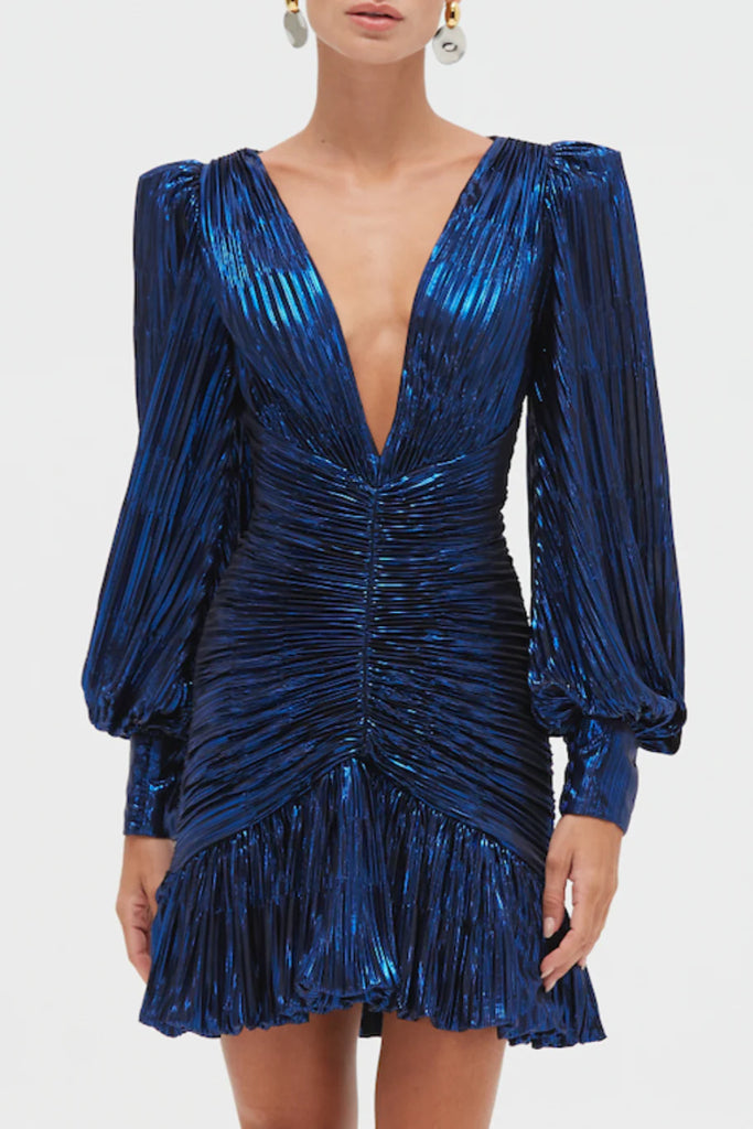 Crafted in a luminous blue pleated fabric, it features a deep V-neckline and bold shoulders that create an empowered silhouette. The ruched detailing through the bodice enhances the shape, while the flounced hem adds a playful, flirty finish. Long sleeves with buttoned cuffs and a small back cutout complete the look with elegance. Perfect for festive nights and special events