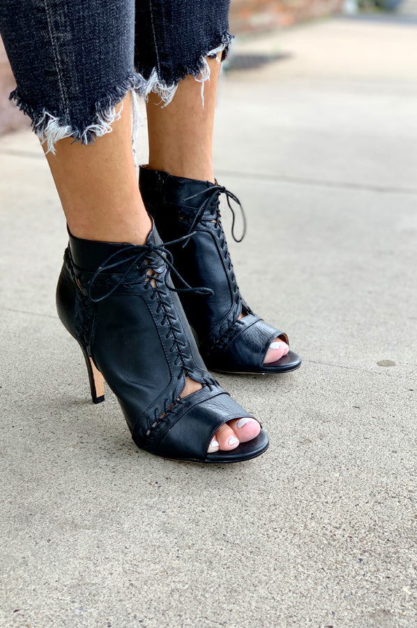 Leather upper with man made sole. Heel measures approx 4" H. Side zip closure. Decorative lace-up and thread detail
