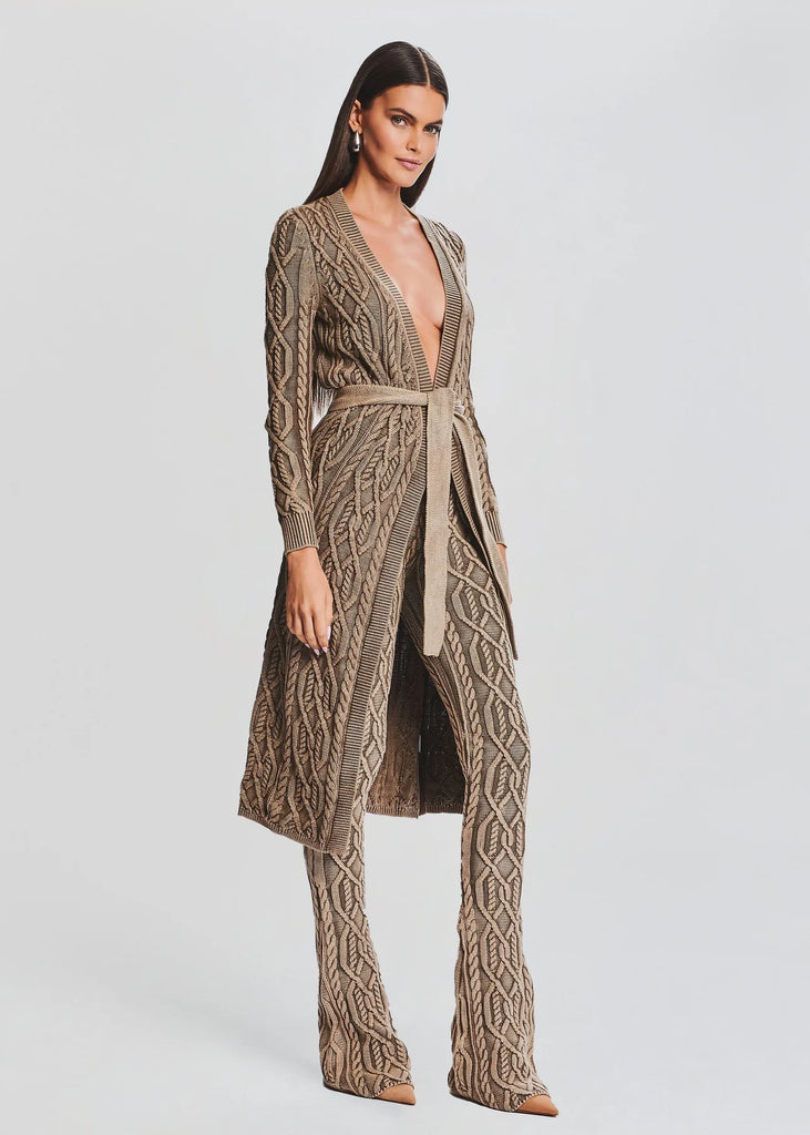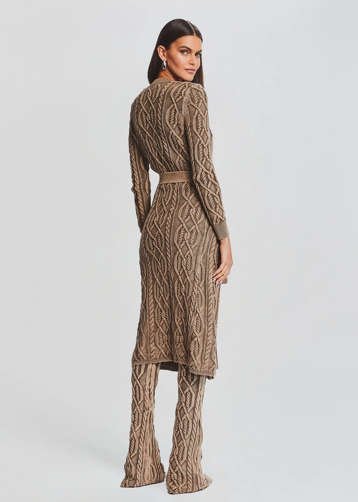 Upgrade your look with SER.O.YA's Adaline Cardigan, a perfect blend of comfort and sophistication. This long cardigan exudes timeless charm, featuring a beautiful cable knit pattern and a belt. Shown here in Washed Tan.