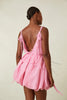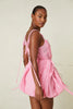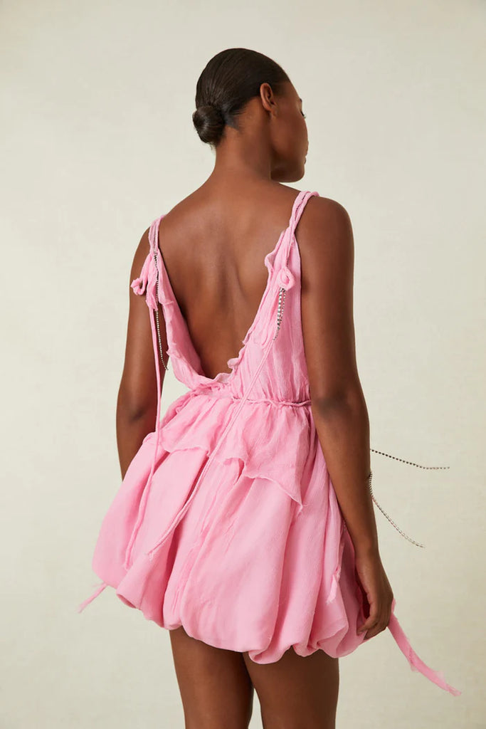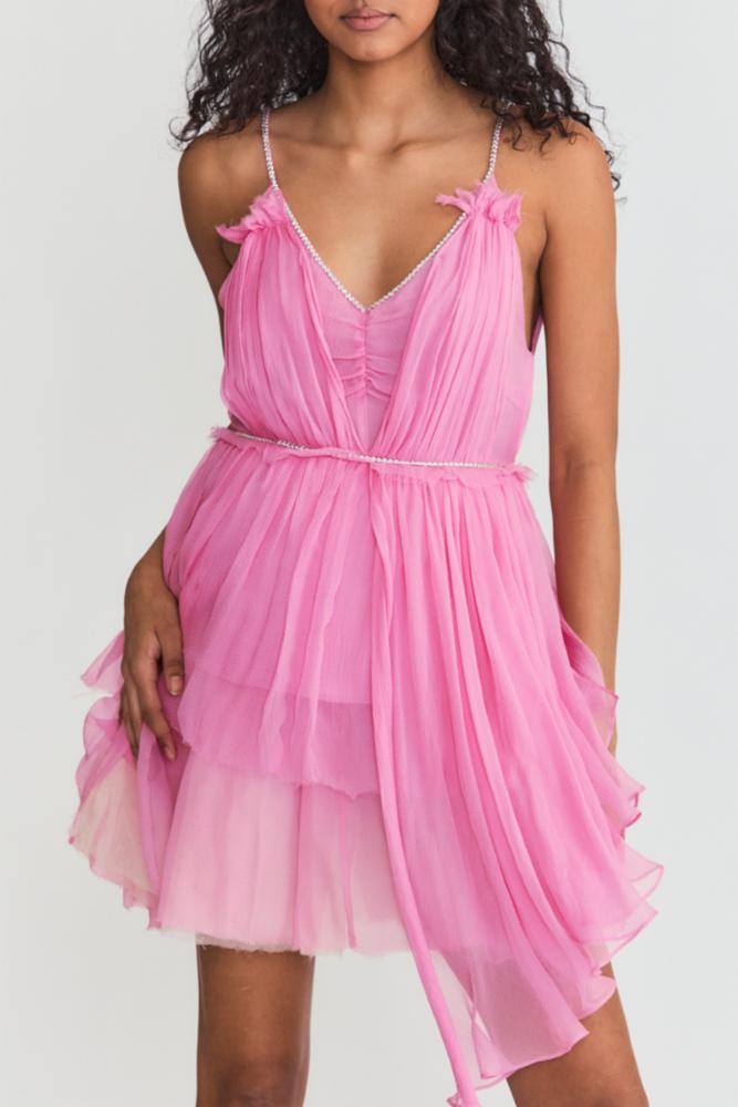 The Ashida Dress. This pretty mini features seersucker chiffon fabric, an asymmetric hem with a pleated drape on the wearer's left. Crystal chains serve as the straps with another chain around the waist. The dress includes a zipper.