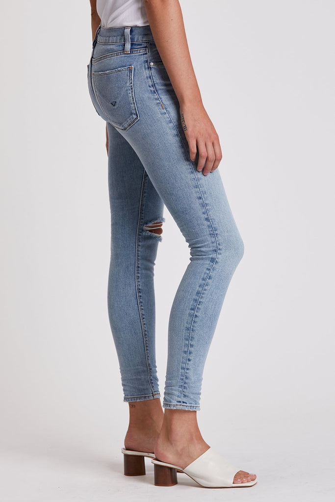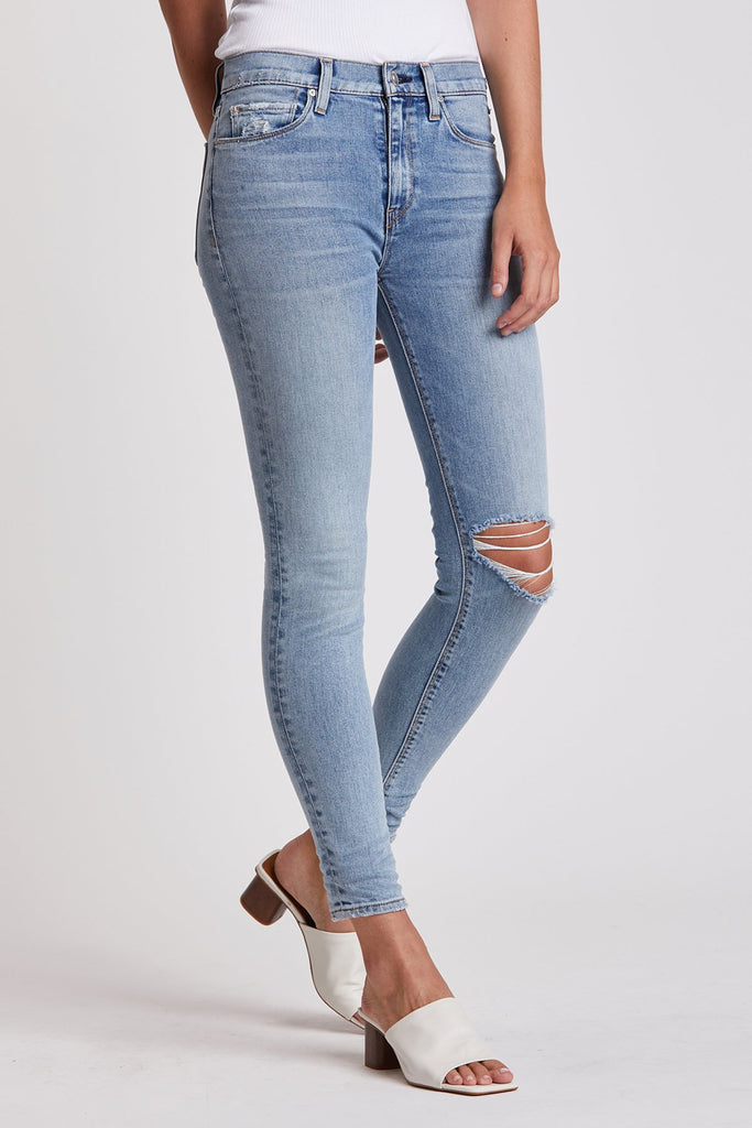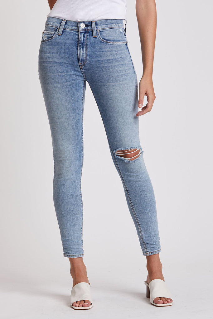 Barbara High-Rise Super Skinny Ankle Jean in light indigo Presto features a slim, contoured fit, an elevated waistline, and a clean finished hem that's cropped at the ankle. Made from soft, super stretch Italian denim designed to hold its shape with extended wear, it's finished with fading and destruction for lots of vintage character.
