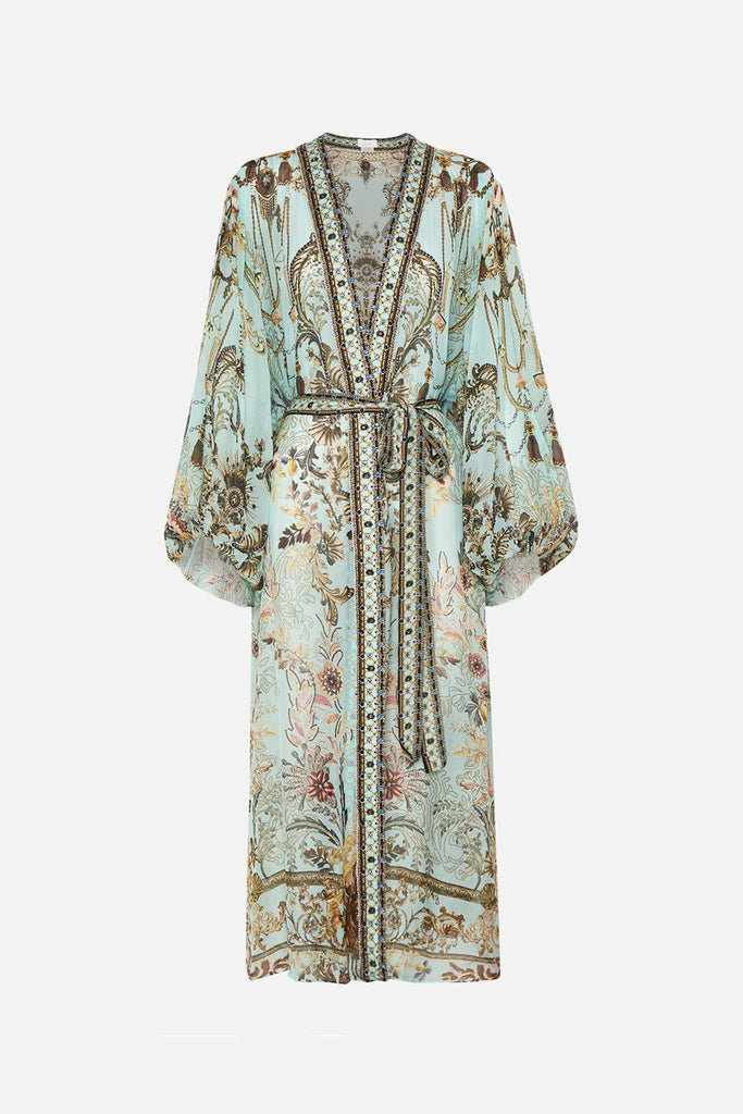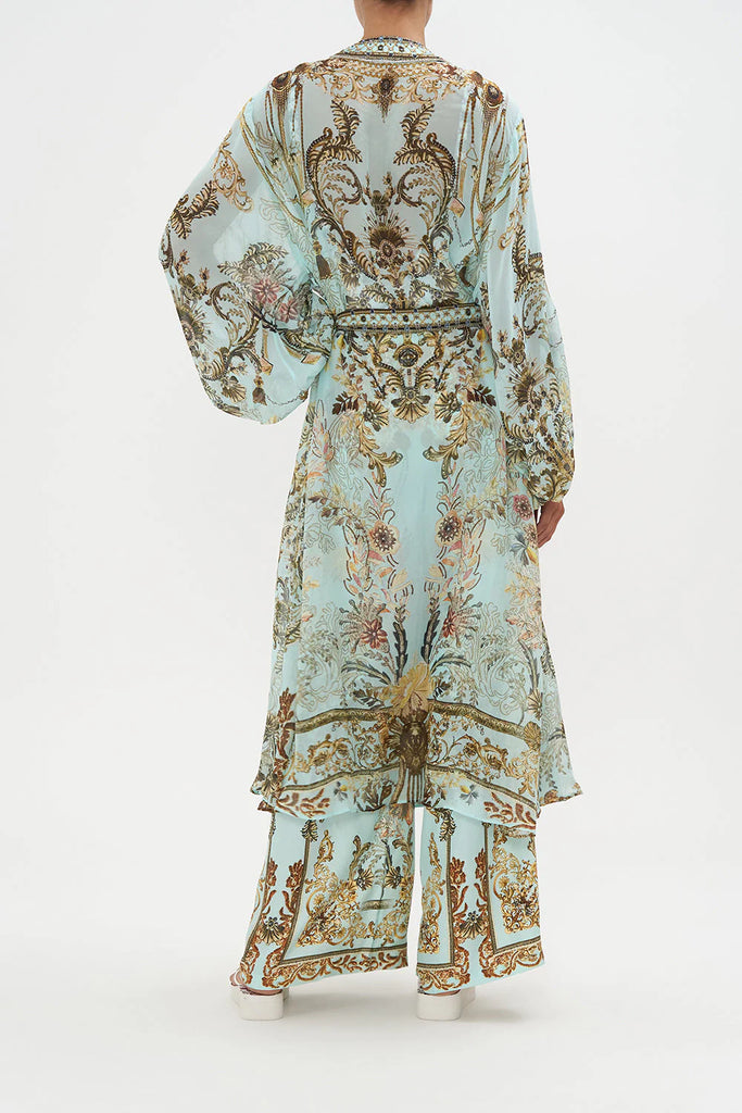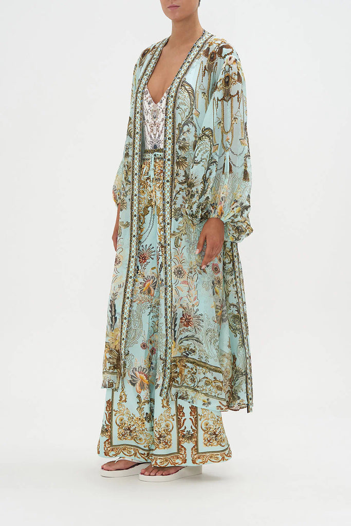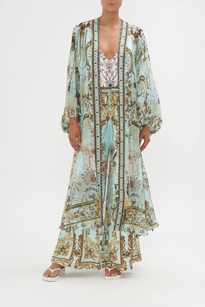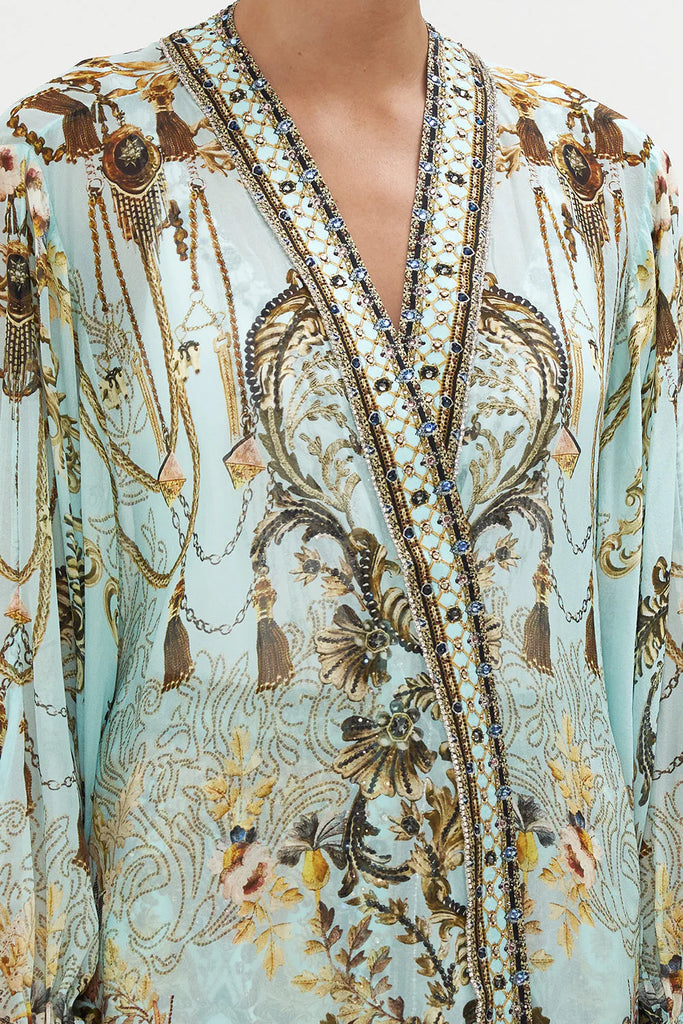 The Adieu Yesterday Blouson Sleeve Layer explores a mesmorising sea of celestial blue hues finished with ornate golden swirls that dance alongside decadent botanical details and exquisite chain cascades. Finished with hand-embellished CAMILLA crystals, this luxury silk layer is home to statement blouson sleeves that dance at the wrist, contrasting neck bands that line the length and a relaxed maxi silhouette.