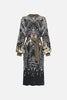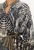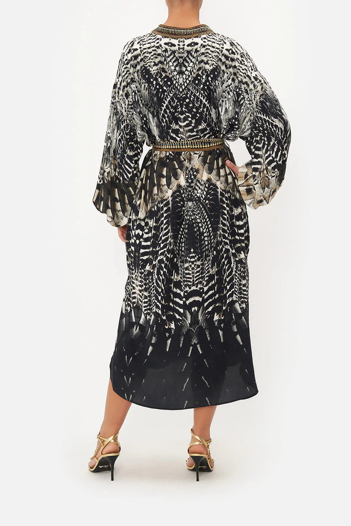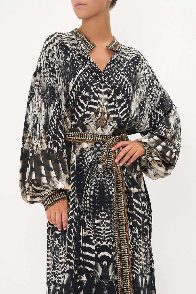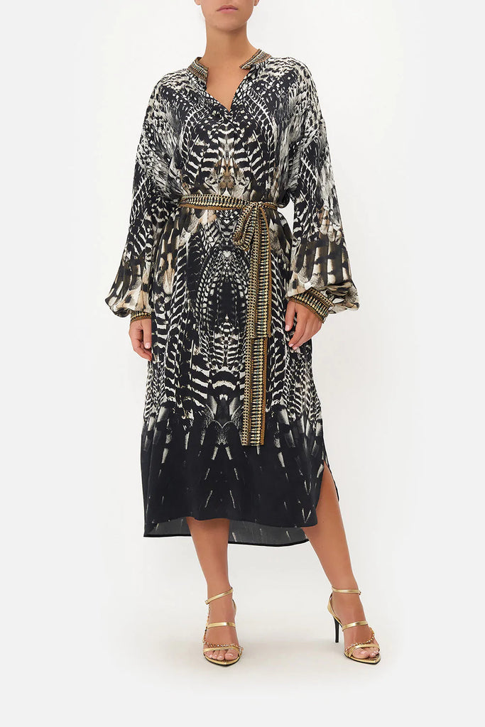 Whisking us into nocturnal majesty amidst the canopies, Night Owl Blouson Sleeve Placket Dress paves the way for a deep midnight hue adorned with cascades of ivory featherings, moments of mocha and wispy white owl details. Finished with hand-embellished CAMILLA crystals, this luxury silk dress features a full blouson sleeve that dances at the wrist, a high-low mini shaped hemline, placket button fastening and a relaxed silhouette.