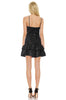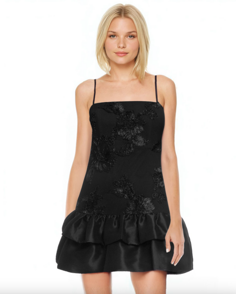 Falling just above the knees, this mini dress flaunts a bodice made from black soutache mesh and embroidered with shimmering florals. The fit-and-flare silhouette hugs your waist before flowing into a voluminous Mikado-tiered skirt. A straight-across neckline with delicate spaghetti straps completes the look, highlighting your shoulders and collarbone.