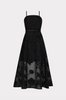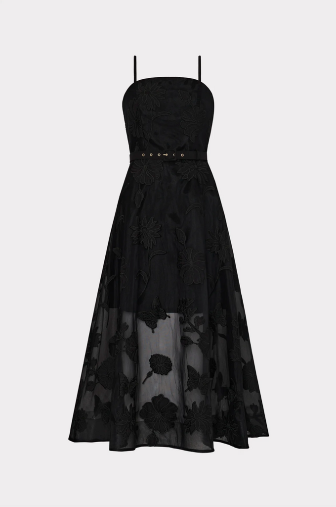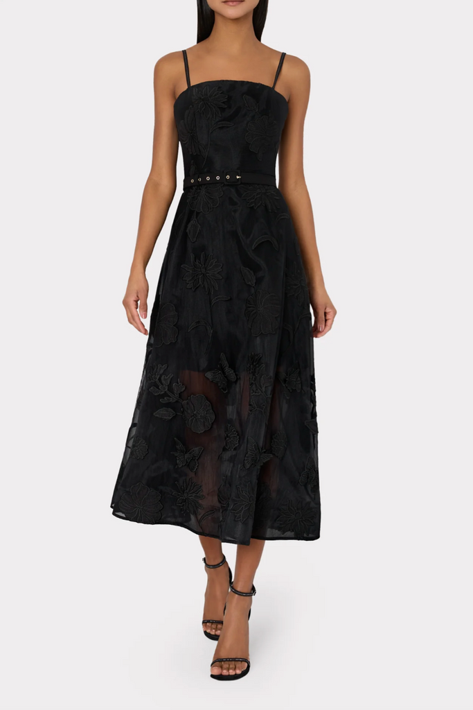 Patterned with signature 3D butterfly and floral appliqué, the intricate design serves as an overlay on this belted dress. It’s fitted at the waist and then falls to an semi-voluminous, midi-length flared skirt that’s leg-baring beneath.