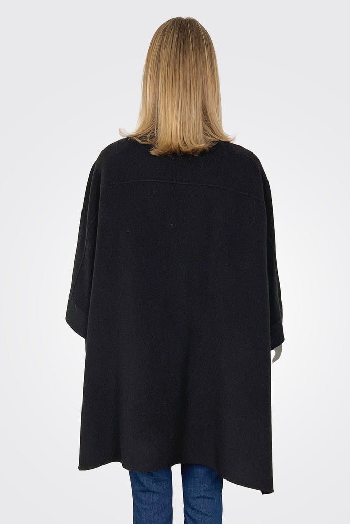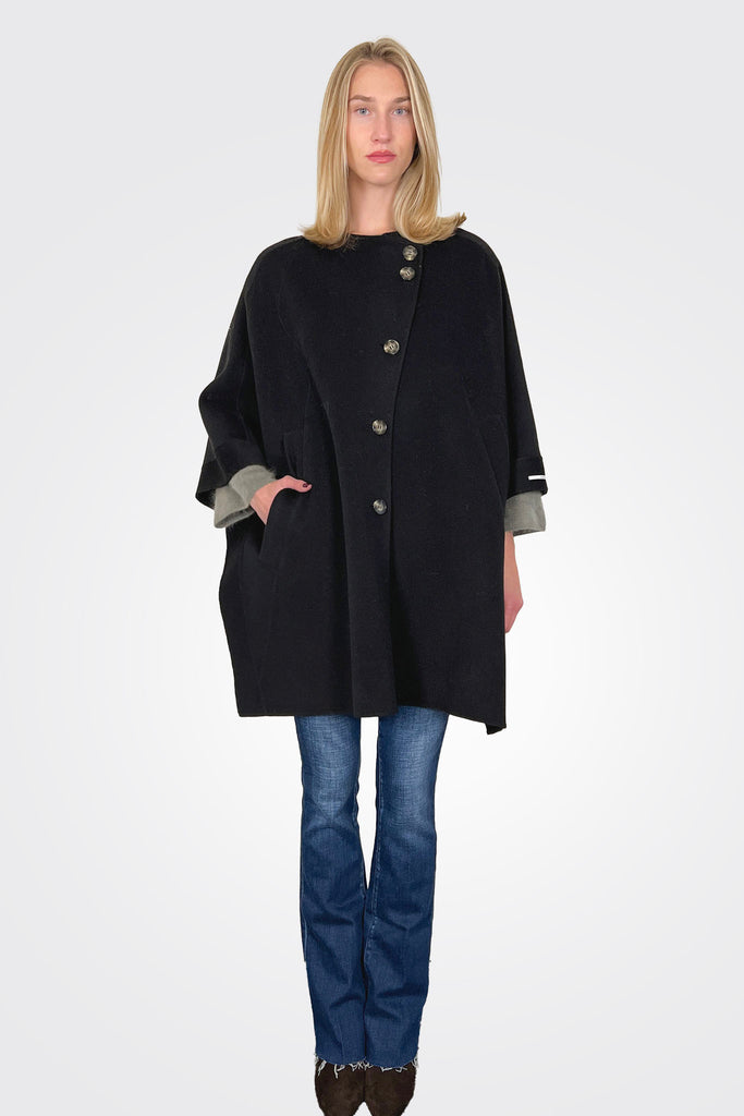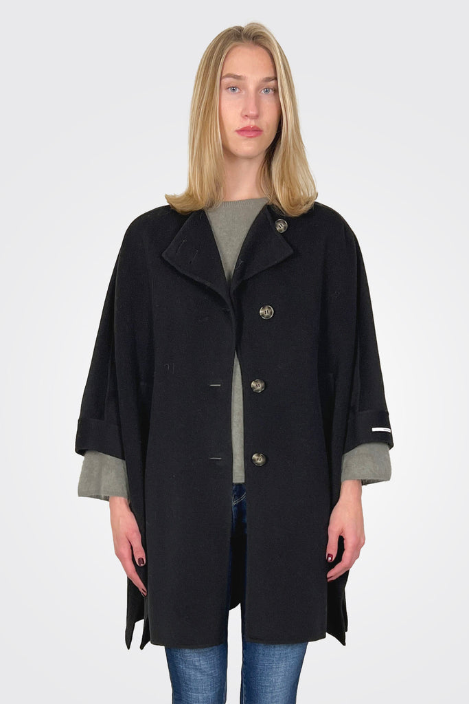 This button-up cape is set apart by its relaxed fit and fine double-faced wool fabric. The sides can be fastened via press stud detail to customise the styling, according to the occasion.