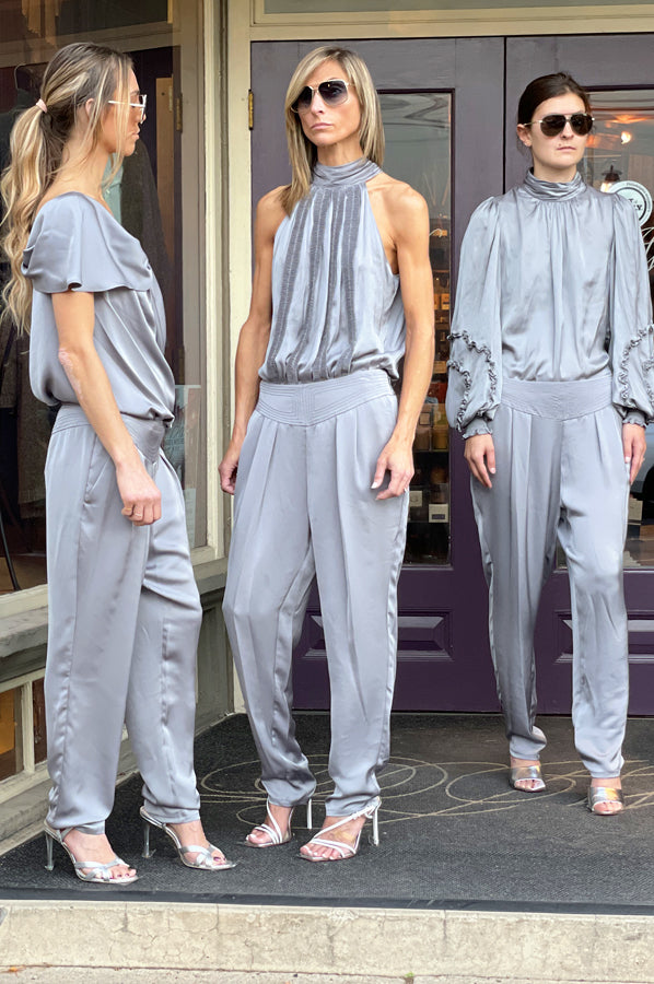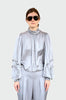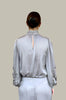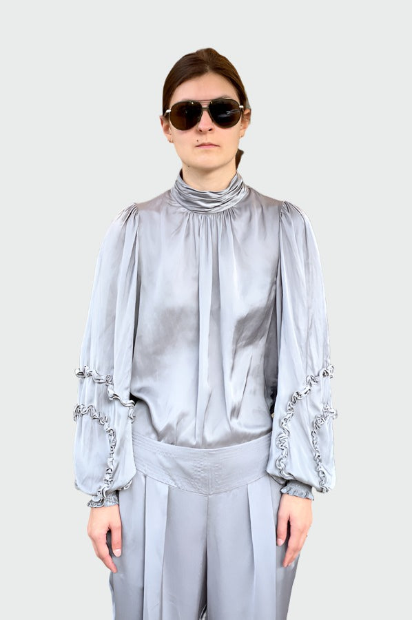A high neckline and ruffled blouson sleeves lend regal elements to a graceful blouse finished with smocked cuffs and a keyhole cutout at the nape.