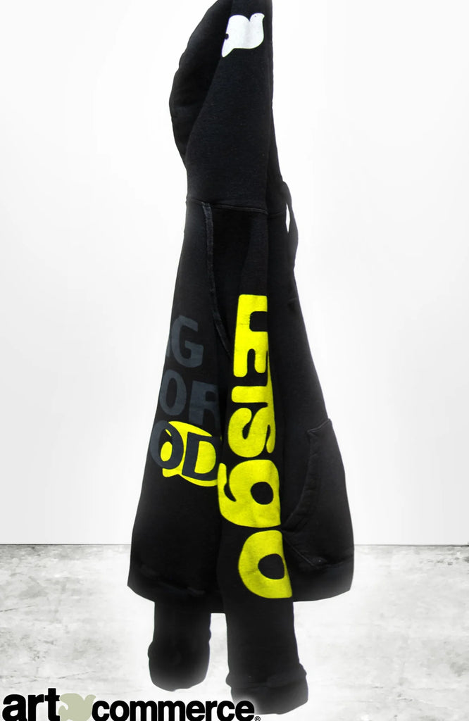 NEW unisex OLDSCHOOL POLYBLEND/FLUFF PULLOVER HOODIE in black space with classic "NEIGHBORHOOD" print on back, cream "FREECITYDOVE" on hood, yellow "LETSGO" on right arm, ribbing at waist and wrist hem with supersoft hand-feel