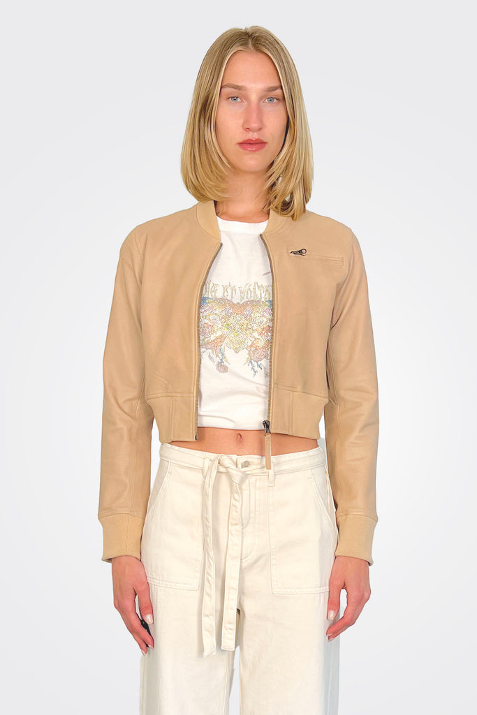 leek and chic. A cropped leather jacket featuring a full zip, knit detailing at the collar, cuffs and waist as well as a zippered pocket. Pair with your sleekest leather pants to be the baddest girl on the block.