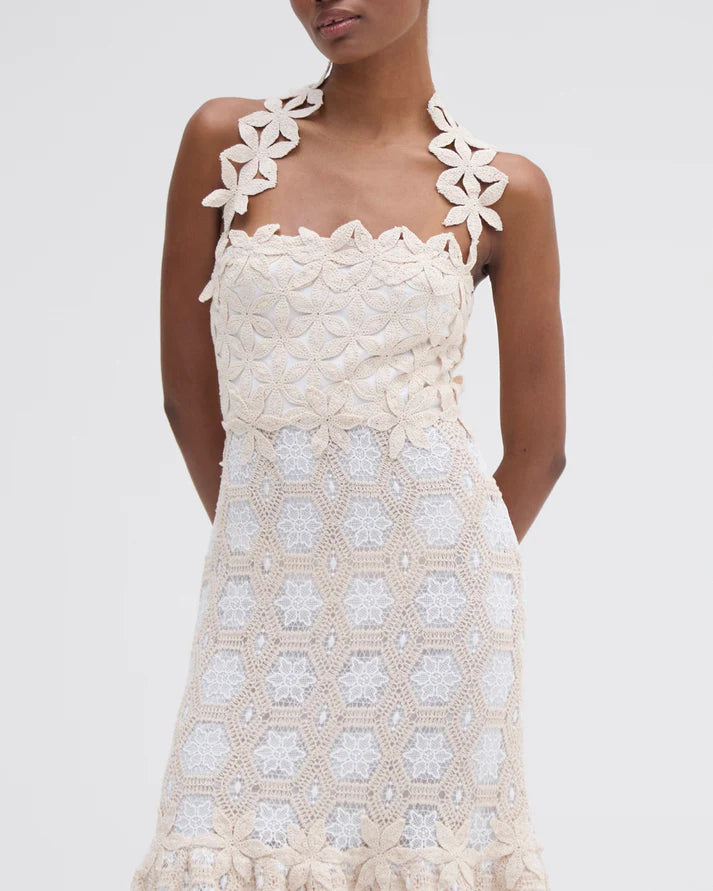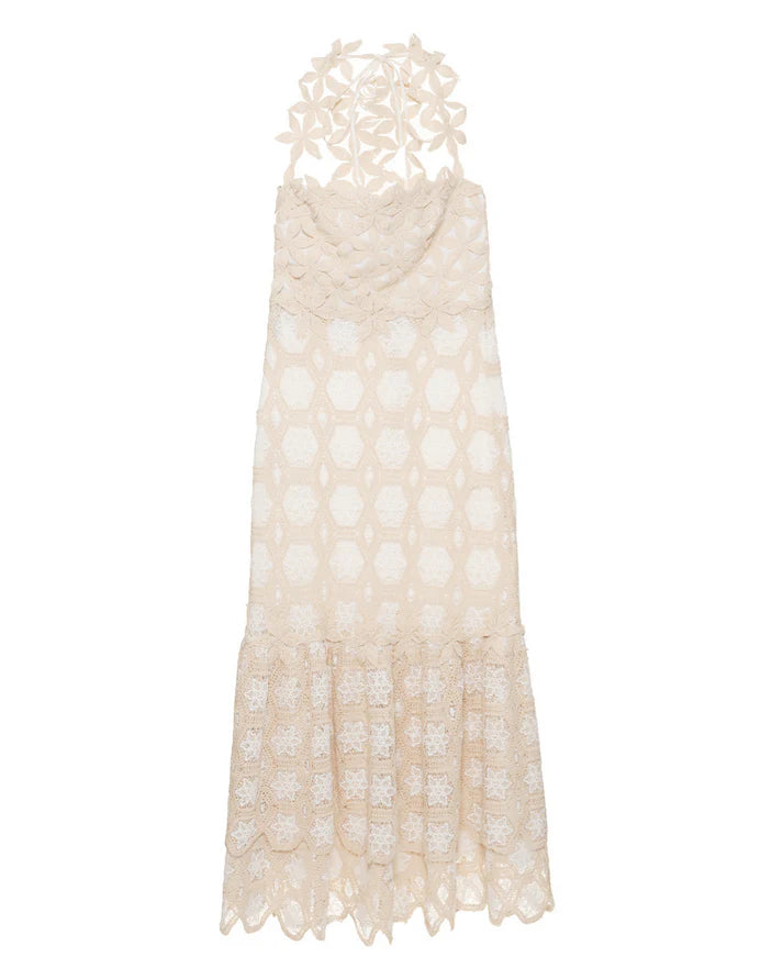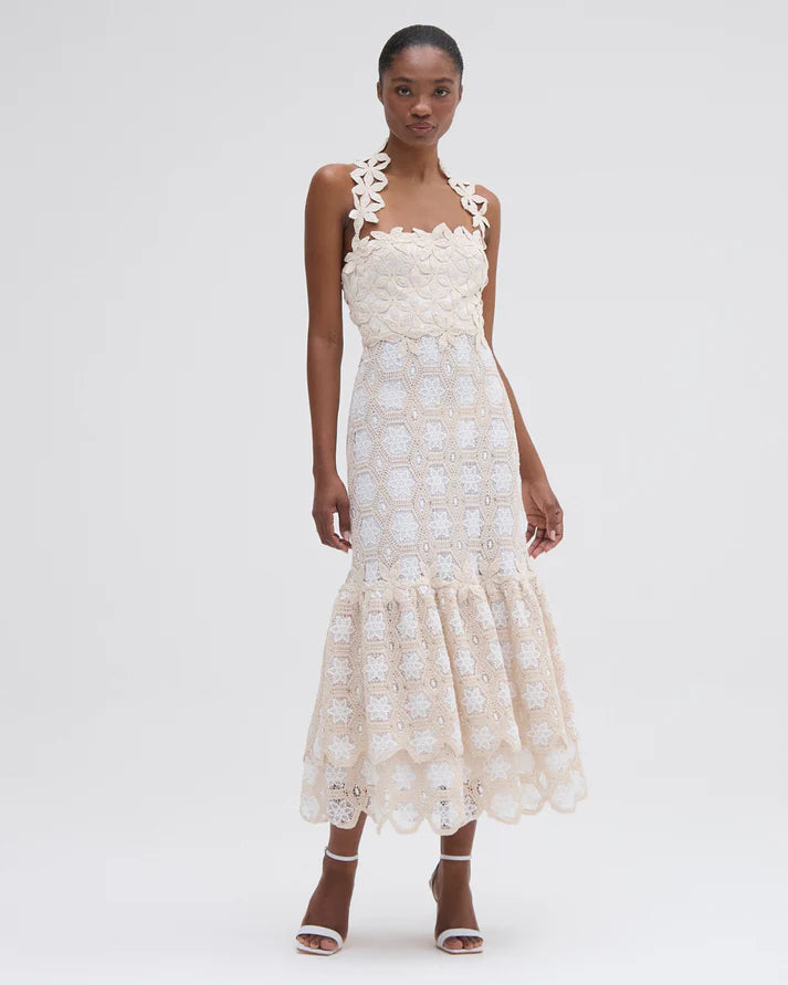 This midi dress features a floral lace square neckline with a slight halter floral strap design, a fitted crochet bodice that is fully lined into a flare pleated lace skirt. Neck tie and exposed zipper closure.
