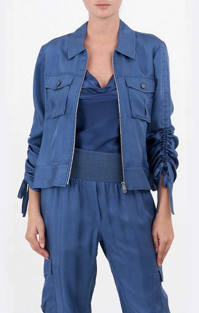 The Dale jacket from Cinq à Sept is crafted of satin-finish cupro in a boxy silhouette. Ruched three-quarter-length sleeves with adjustable ties and chest patch pockets define this zip-front style.