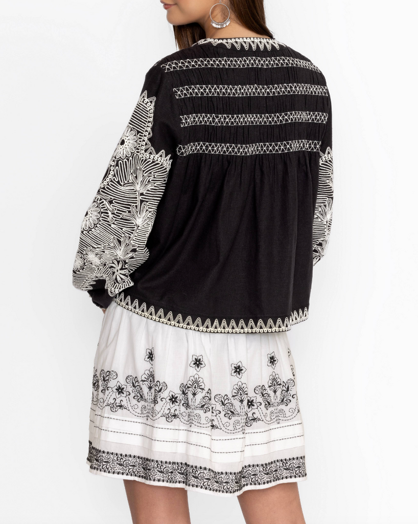 Crafted from a unique blend of linen and cotton with a hint of stretch, the Kimber Elaine Jacket is the perfect combination of comfort and impeccable style. Featuring a rounded collar and smocking at the shoulders, this jacket offers intricate embroidered detailing and is finished with bell sleeves and a classic hook and eye closure. Layer over a bold tank and pair with white linen pants for a timeless, resort-ready look.