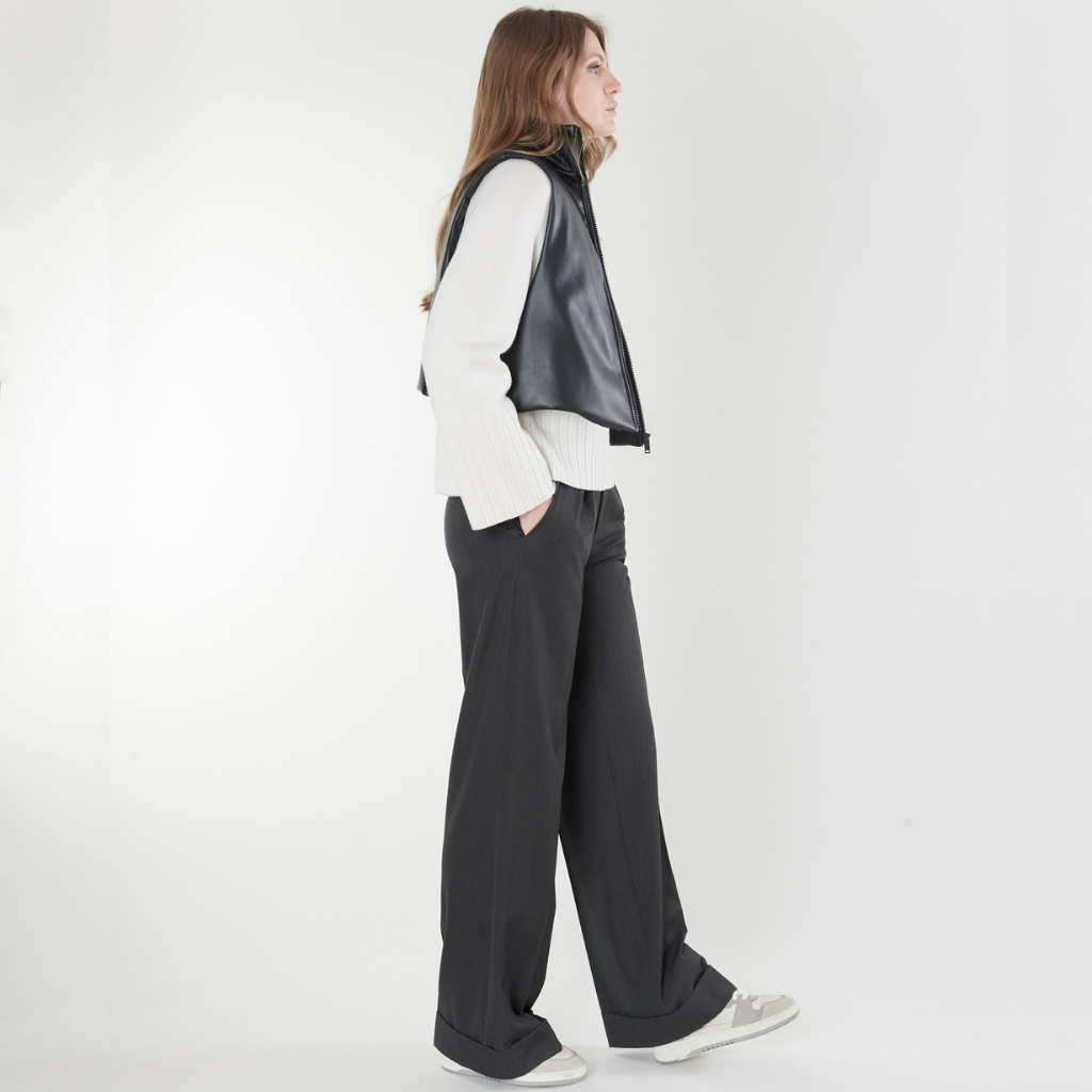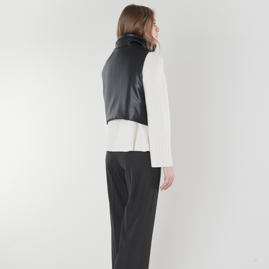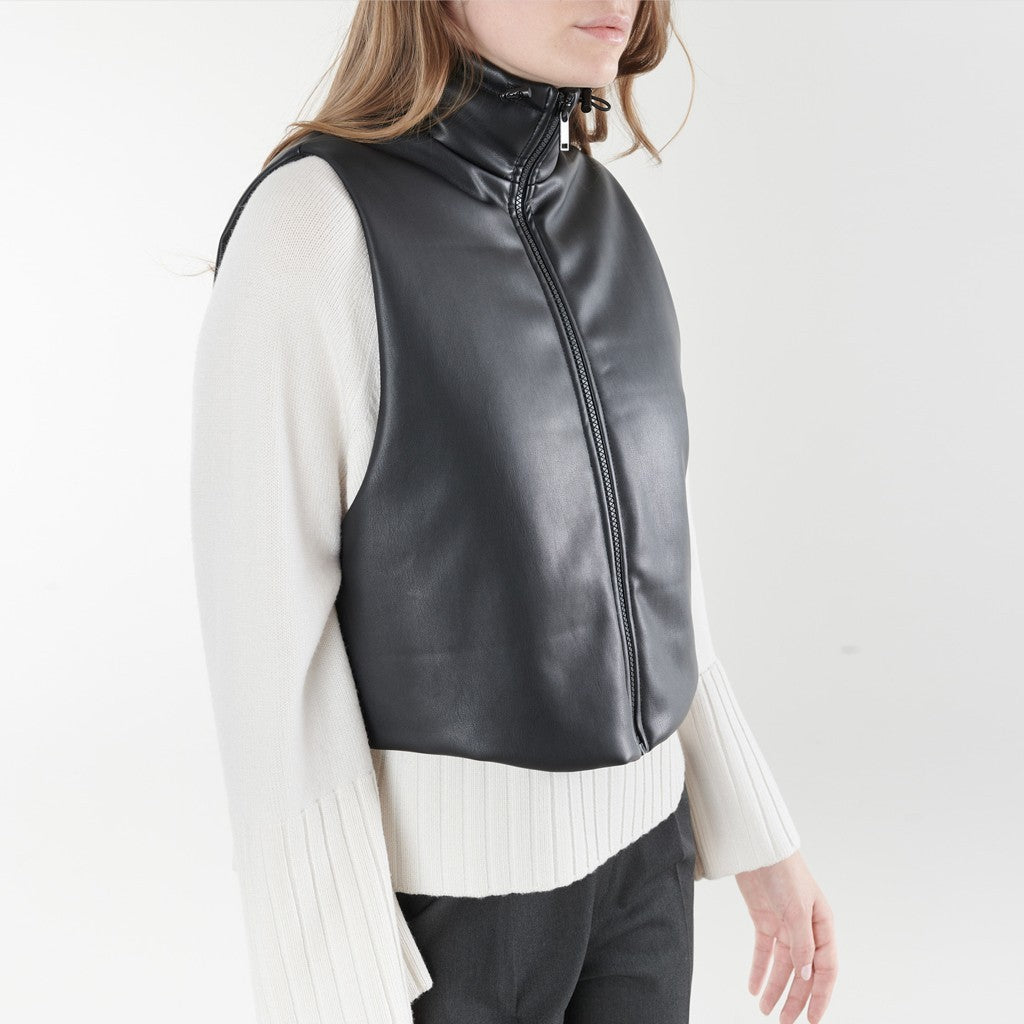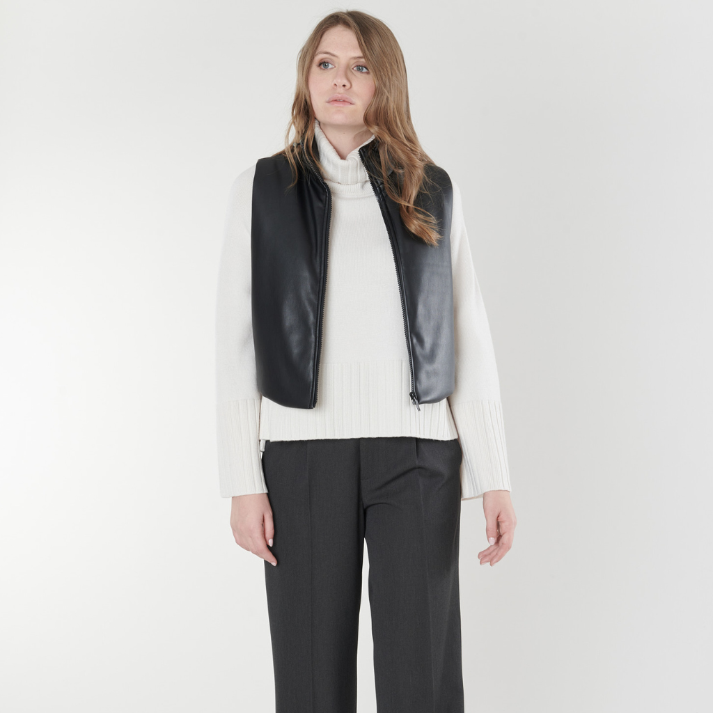 Sleeveless vest in vegan leather. Neckline closed with a zip. Straight base, shorter at the back.