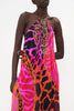 The Always Change Your Spots Gather Neck Halter Maxi Dress sets the scene with hot pink giraffe print complete with swirls of gold chain detailing, splashes of midnight and moments of zesty sunset hues. Crafted from signature CAMILLA silk, this luxury dress plays host to a gathered halter neckline, hand-embellished crystals, metallic hardware and a relaxed silhouette that falls into a high-low maxi hemline.