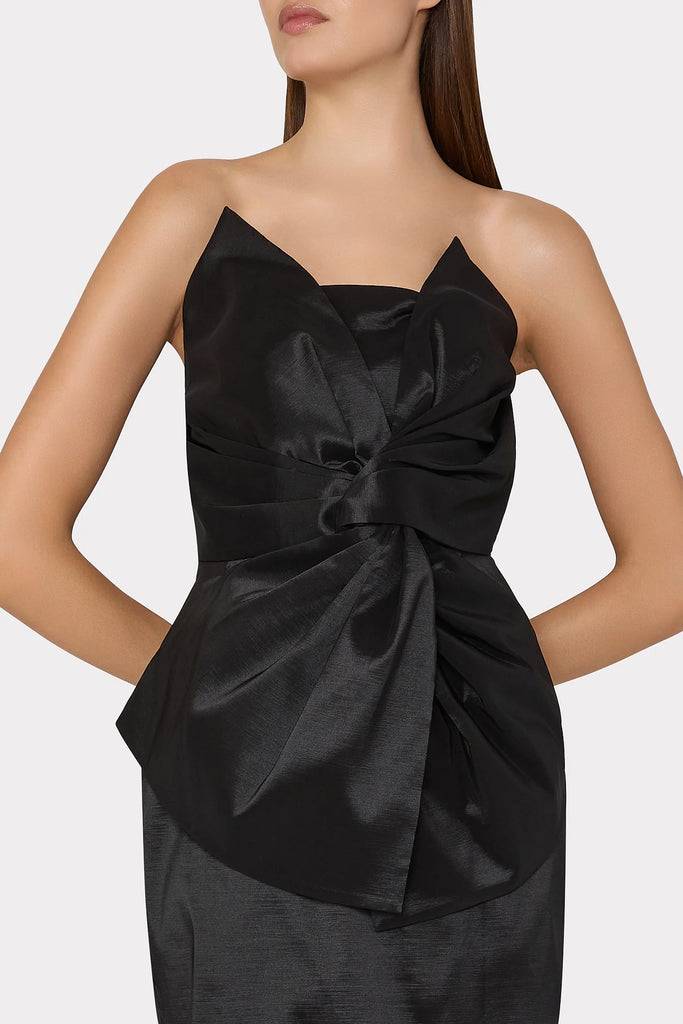 The Harlow dress is cut from luxe taffeta. This show-stopping cocktail dress moment is accented with an oversize bow detail across the bodice. Style yours with silver jewelry and an ankle strap heel.