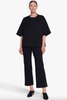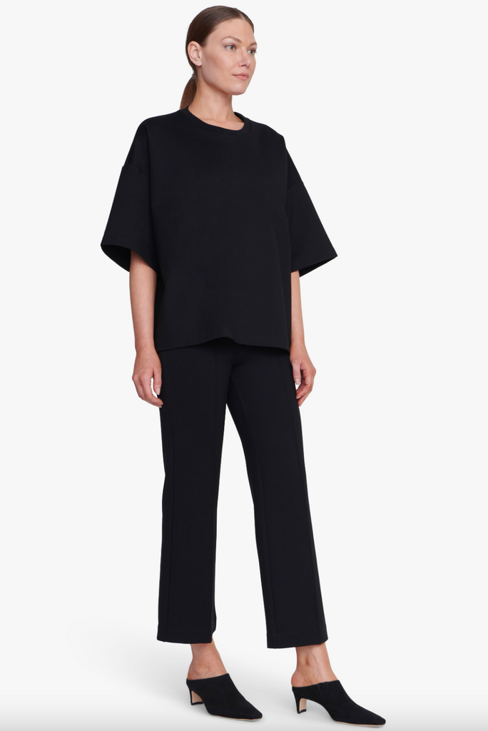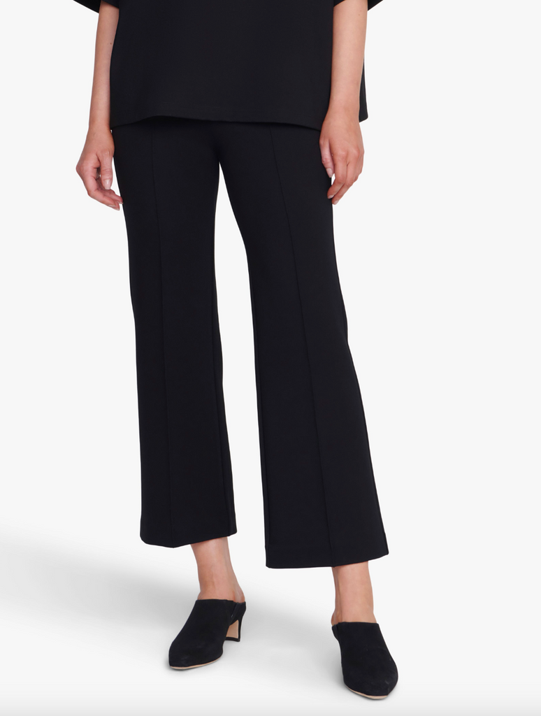 A sleek mid-rise, cropped pant made with high stretch twill is casual and classic. Two back darts for shaping, and no pockets suggest a minimal look that is also ideal for layering.
