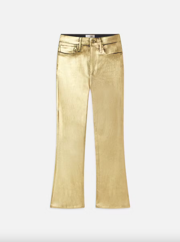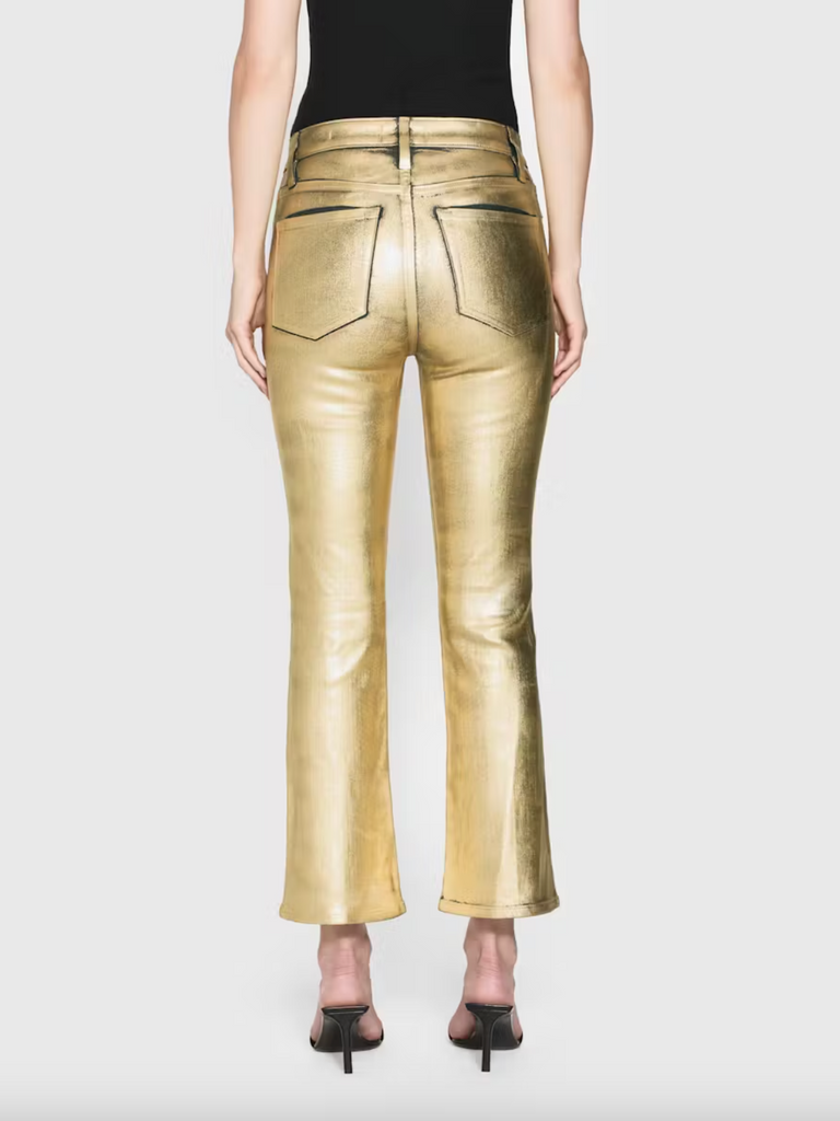 bestselling Le Crop Mini Boot, now covered in gold chrome. The style has a high rise, form-fitting hips, slight bootcut kick at the knee, and flattering cropped length to shows off your best shoes. Crafted from comfort stretch denim for enhanced wearability, this rendition shines from dusk to dawn.