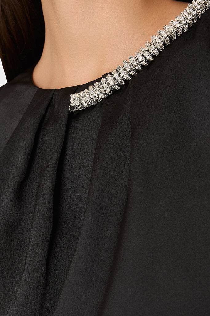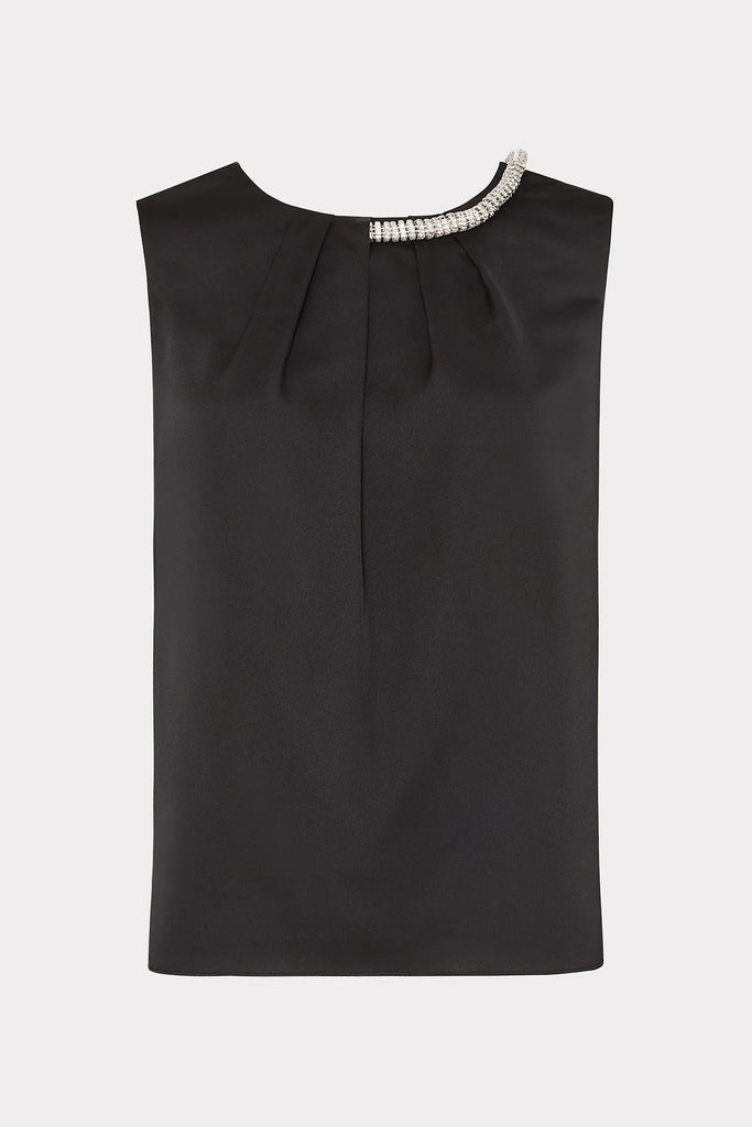 Made to pair with all of our Fall pants and skirts, the Lily blouse is cut from a luxurious satin fabric and embellished with an intricate crystal detail at the neckline. It’s finished with a keyhole detail and a covered button closure at the back of the neck.