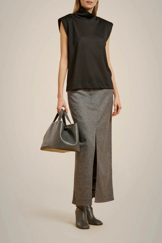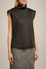 Lurex jersey top, high neck, armholes, shoulder pads, straight hem.