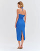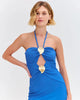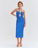 This midi dress features our Merian Knit material with a halterneck tie, keyhole cut out detail and special hardware appliques throughout the top, into a fitted mid length skirt. Concealed back zipper closure.
