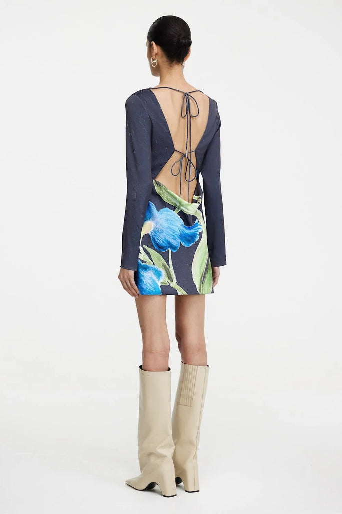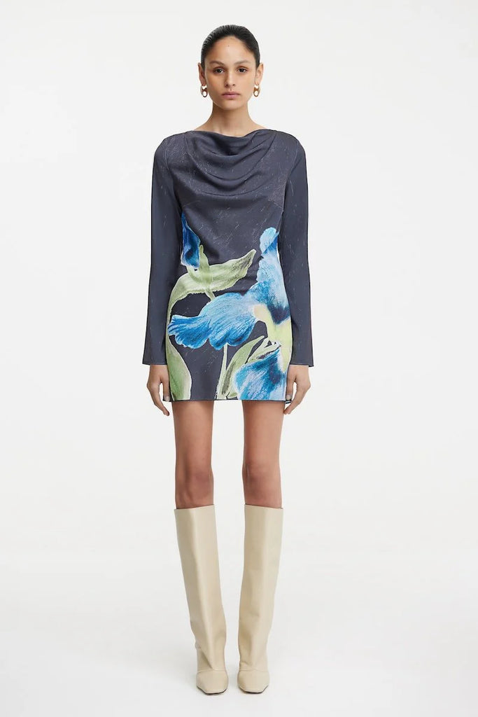 The Merida Mini Dress in Midnight Botanic is a standout piece for day or night. Crafted from crinkle-textured fabric with a striking floral placement print, it features a pleated cowl neckline and an open back with rouleaux ties for an elegant, easy fit. Style it casually with sandals or elevate it with a heel for a celebratory event.