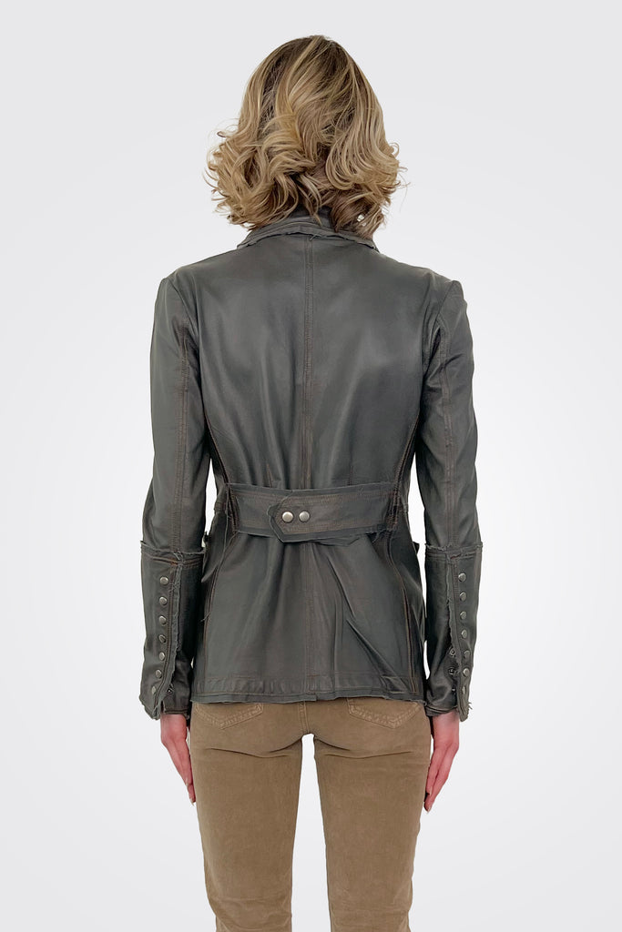 One of Jakett's most popular products, Meryl Washed Leather is a long utility jacket with cargo pockets and a back adjustable waist.
