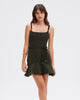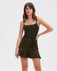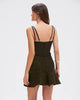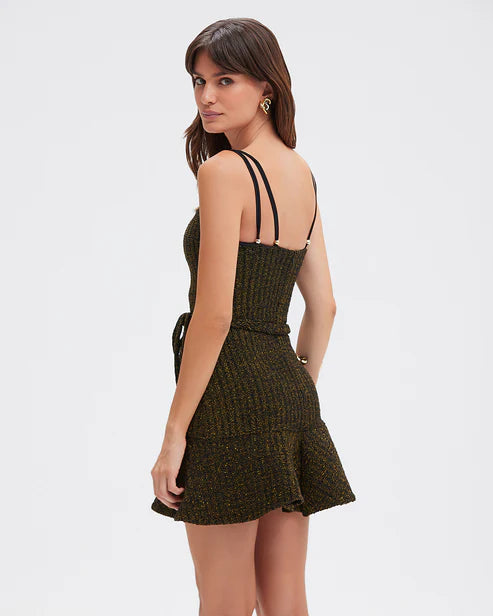 This mini dress features a knit material with a fit to flare design and a braided belt detail. Double to single adjustable straps