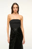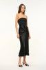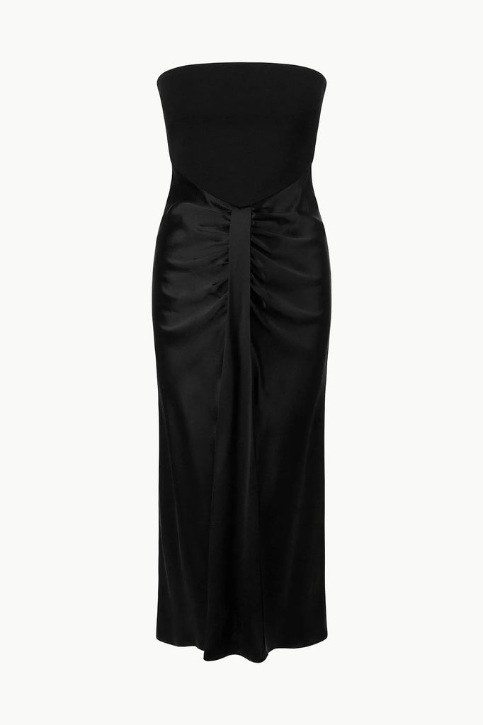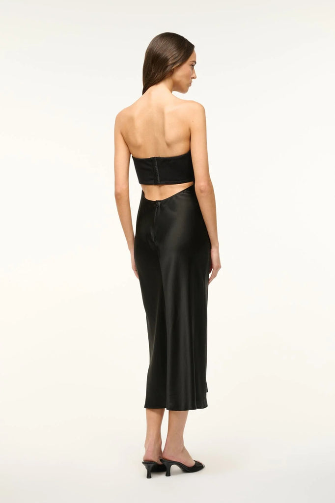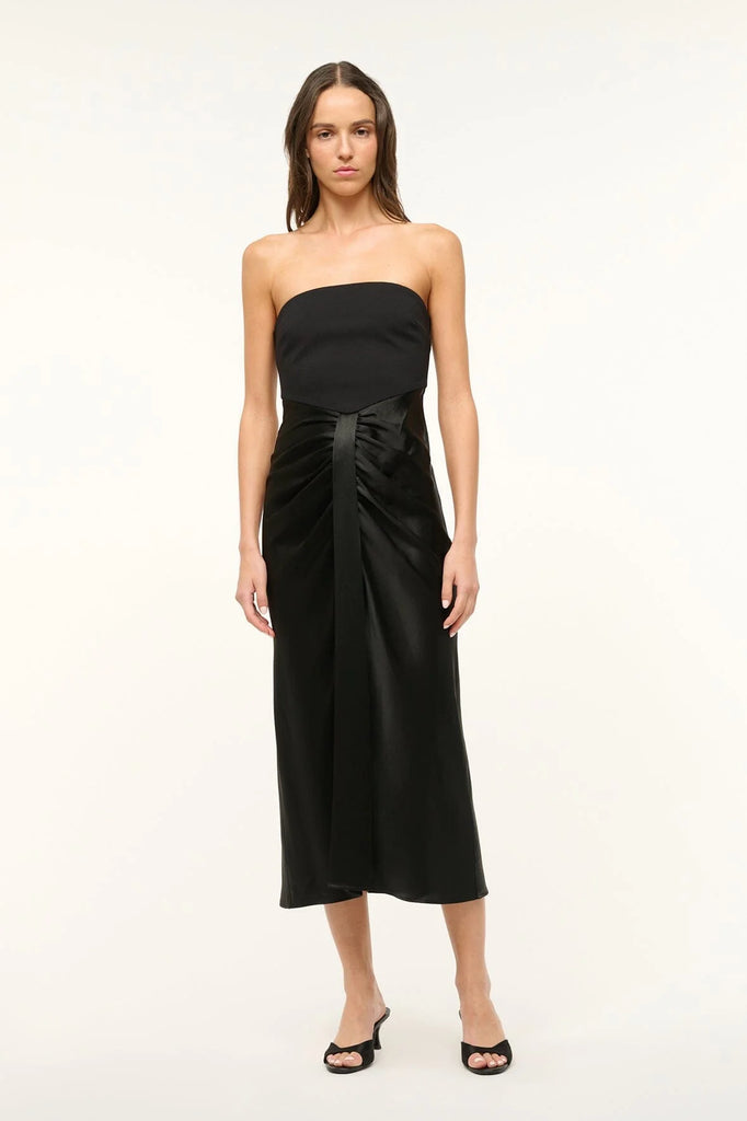 An update to our timeless Wayfaring Dress, the Midi Wayfaring Dress is a midi length evening dress with a ponte bodice and a ruched satin skirt. This strapless dress features a strapless bra-friendly bodice, with an open lower back.