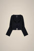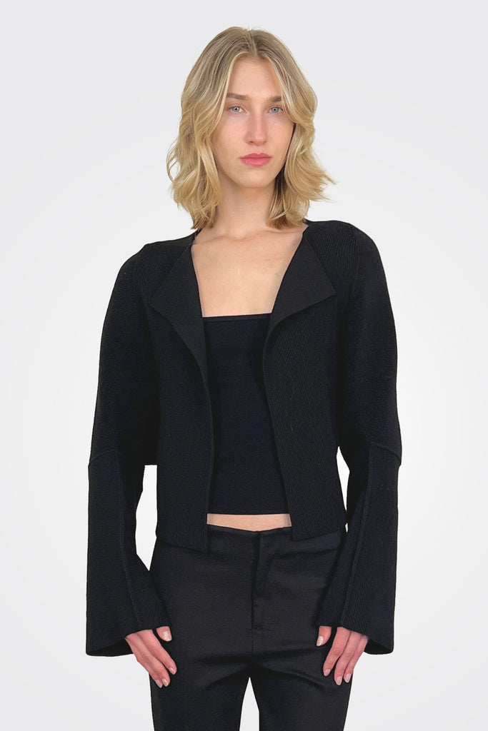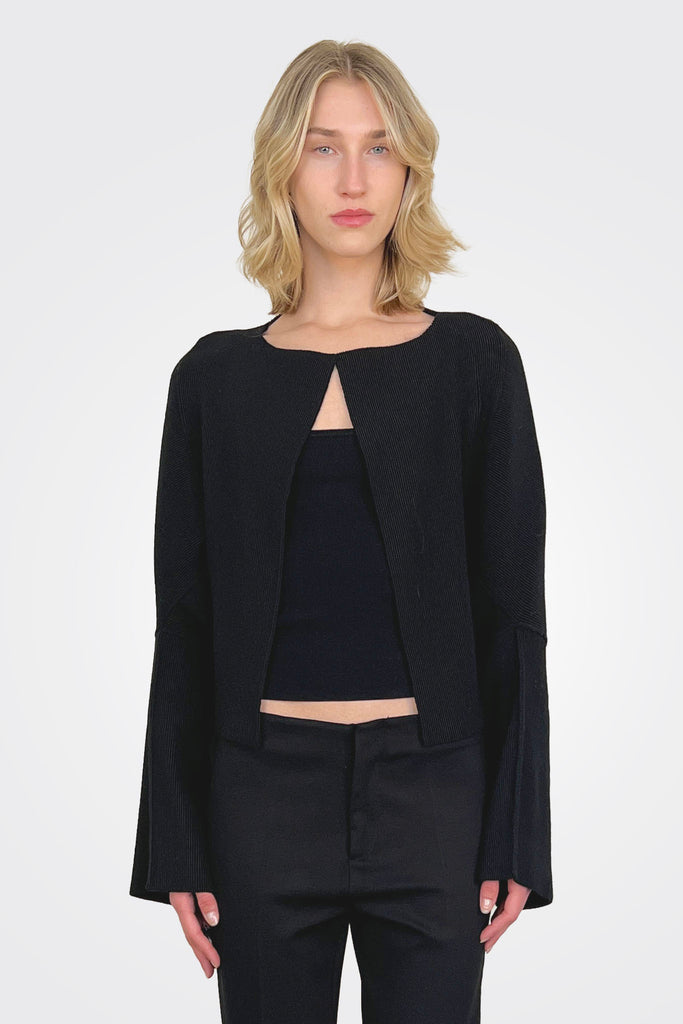 100% extra-fine merino wool crew neck cardigan, ottoman pattern, vis a vis front opening, three-quarter sleeves.
